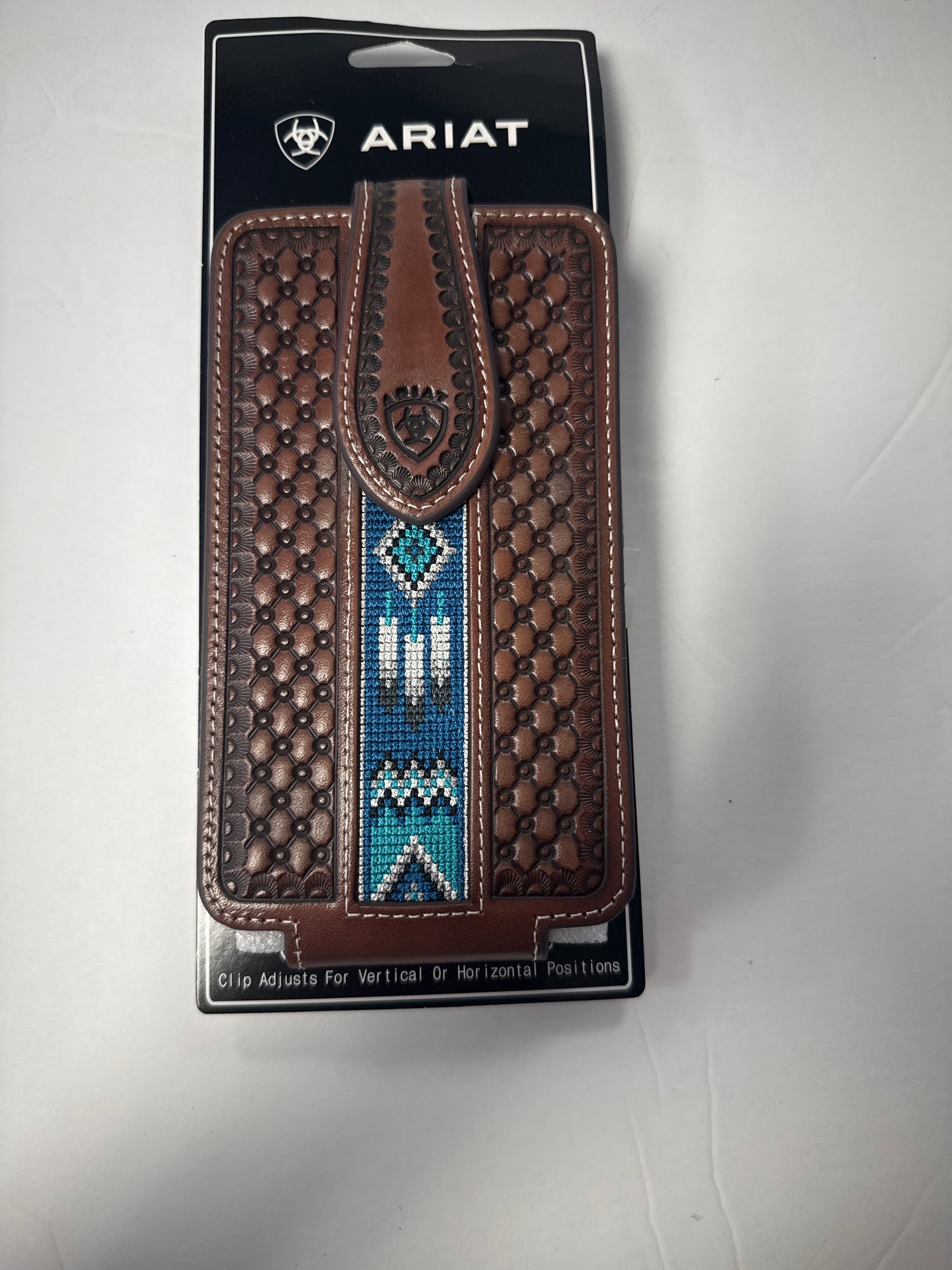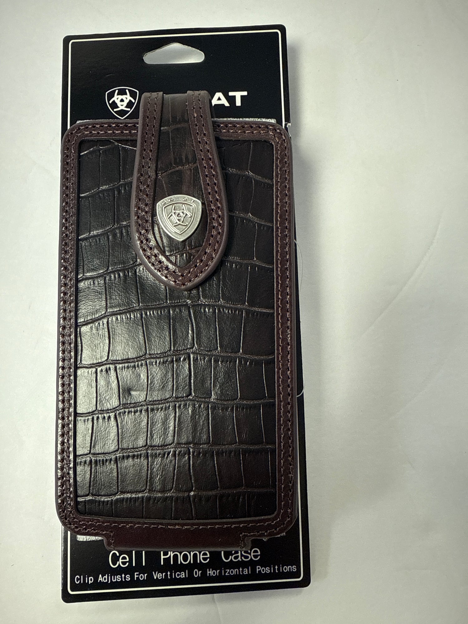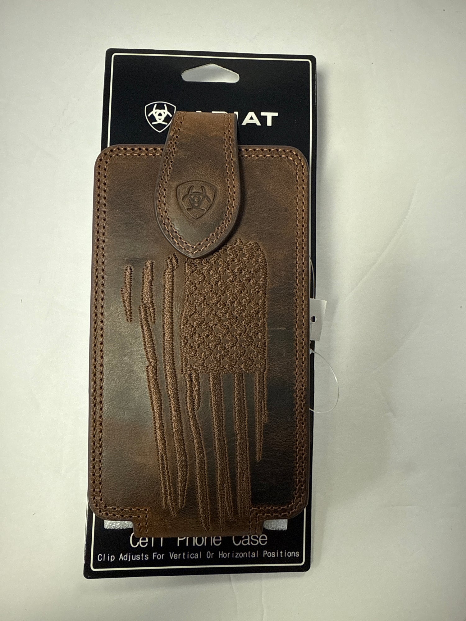 Carry your phone in style with this Ariat cell phone case. Made from high-quality leather, it features a secure magnetic closure and a sturdy belt clip for convenience and durability. (Funda para celular Ariat de cuero con clip para cinturón y cierre magnético