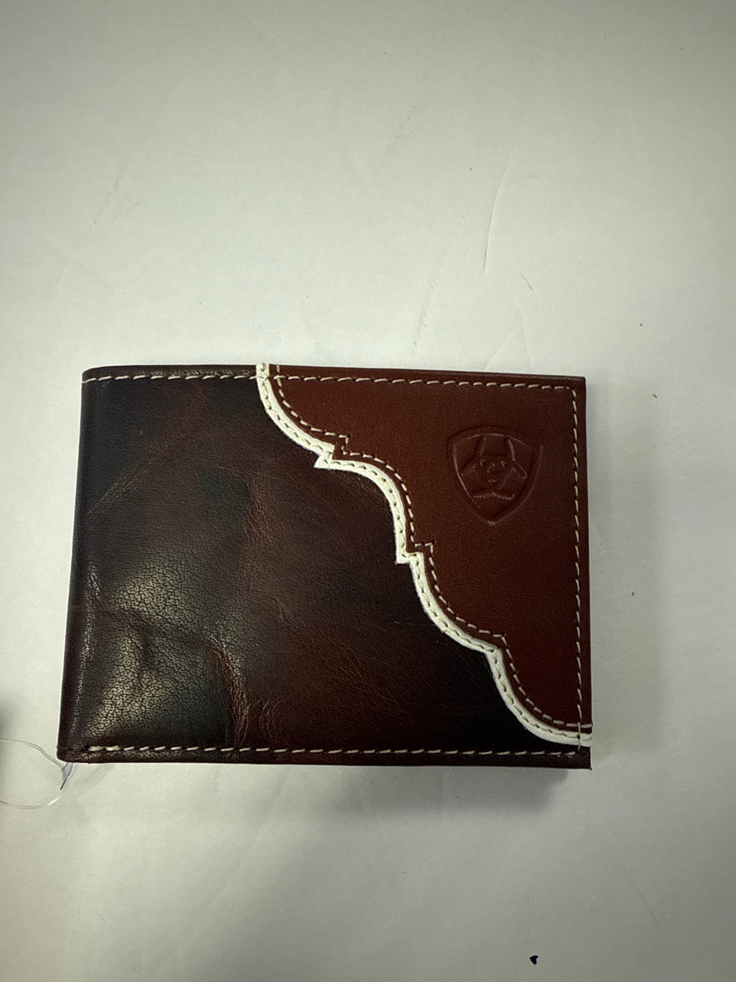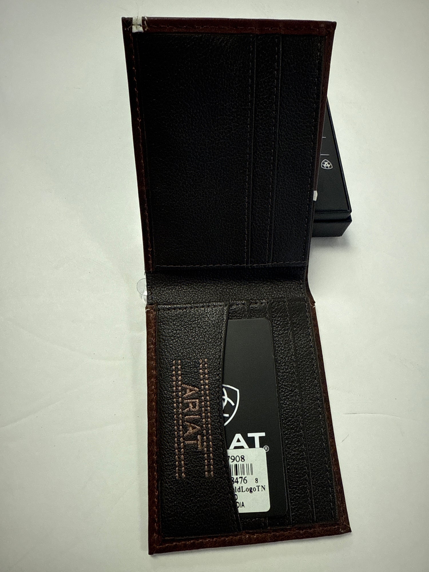 Ariat bi-fold wallet made from genuine leather, featuring a sleek design with multiple card slots, ID window, and embossed Ariat logo. Durable and stylish for everyday use. (Cartera Ariat tipo bi-fold de cuero genuino, con compartimentos para tarjetas, ventana para identificación y diseño elegante.)