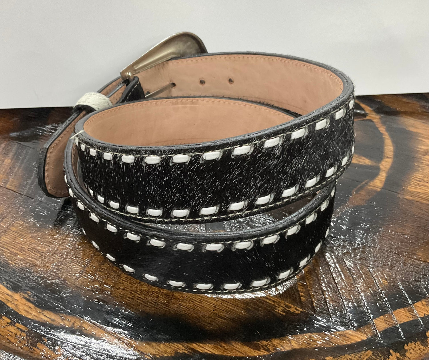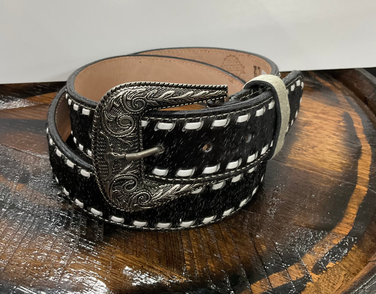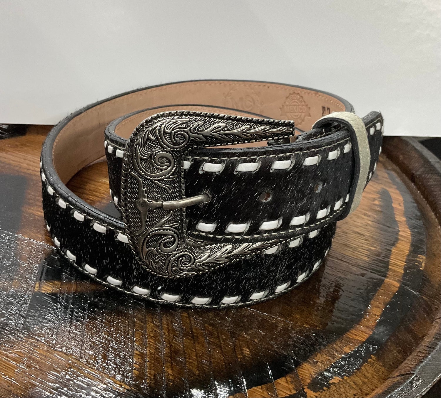 Black cowhide belt with contrast white stitching and rawhide lacing. Rugged, eye-catching western look.