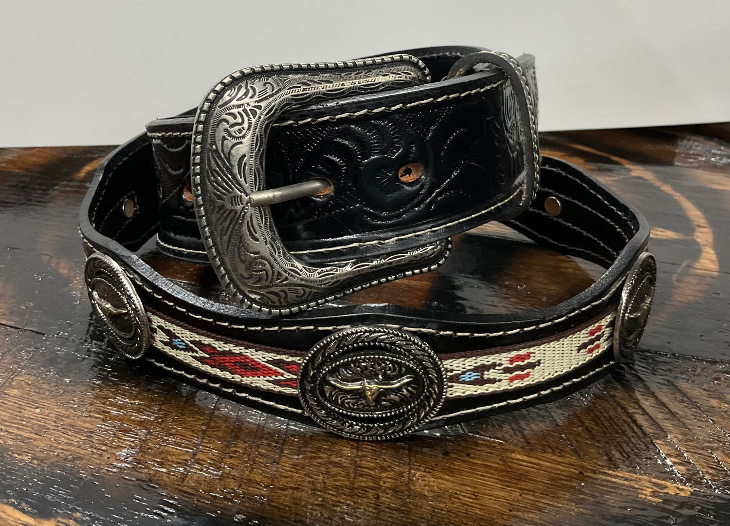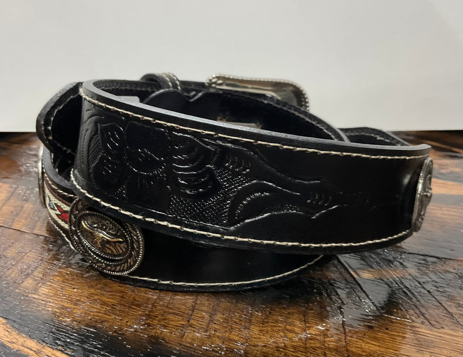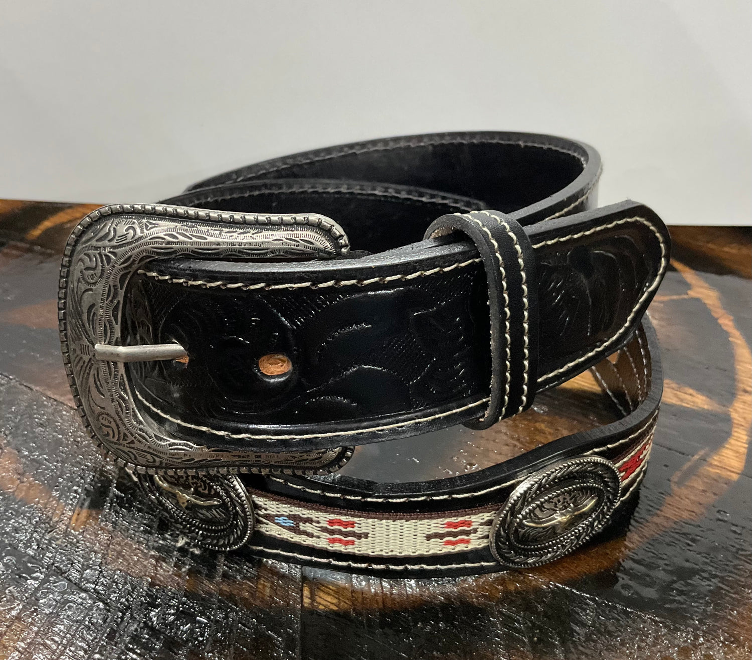 Black leather belt with floral tooling, tribal-style stitching, and silver conchos. Handmade in Mexico.