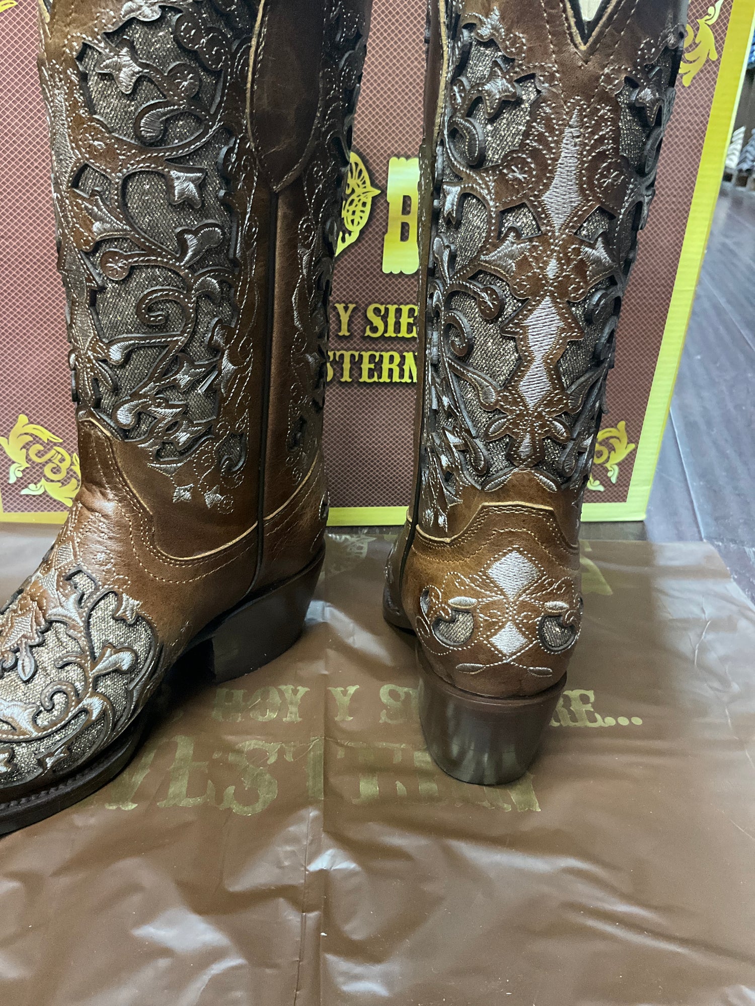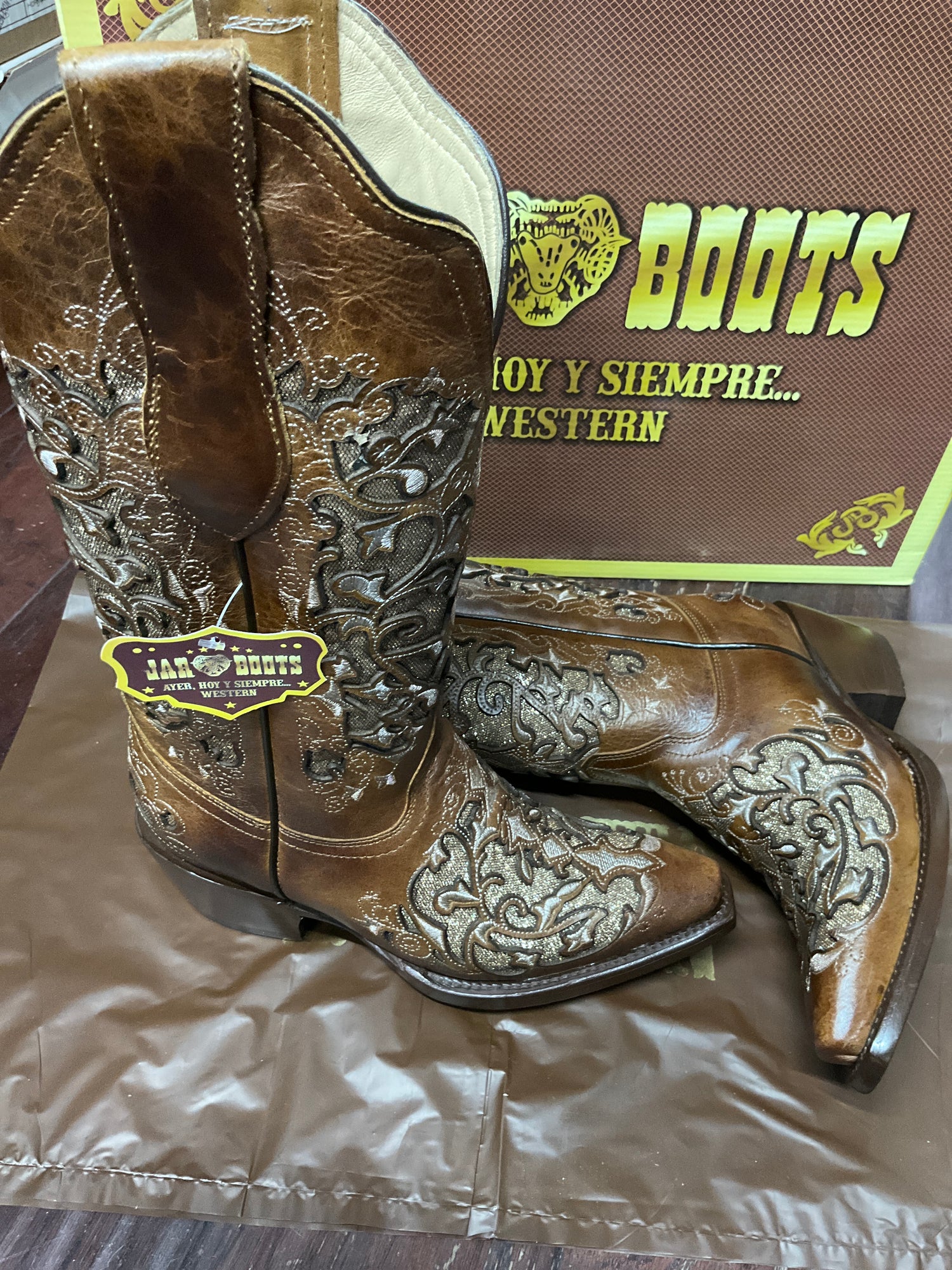 Bota de mujer Jar Boots color Miel/Miel, diseño picudo con acabado tipo cráter y detalles bordados que resaltan su estilo western elegante y femenino. Ideal para lucir con cualquier outfit vaquero.