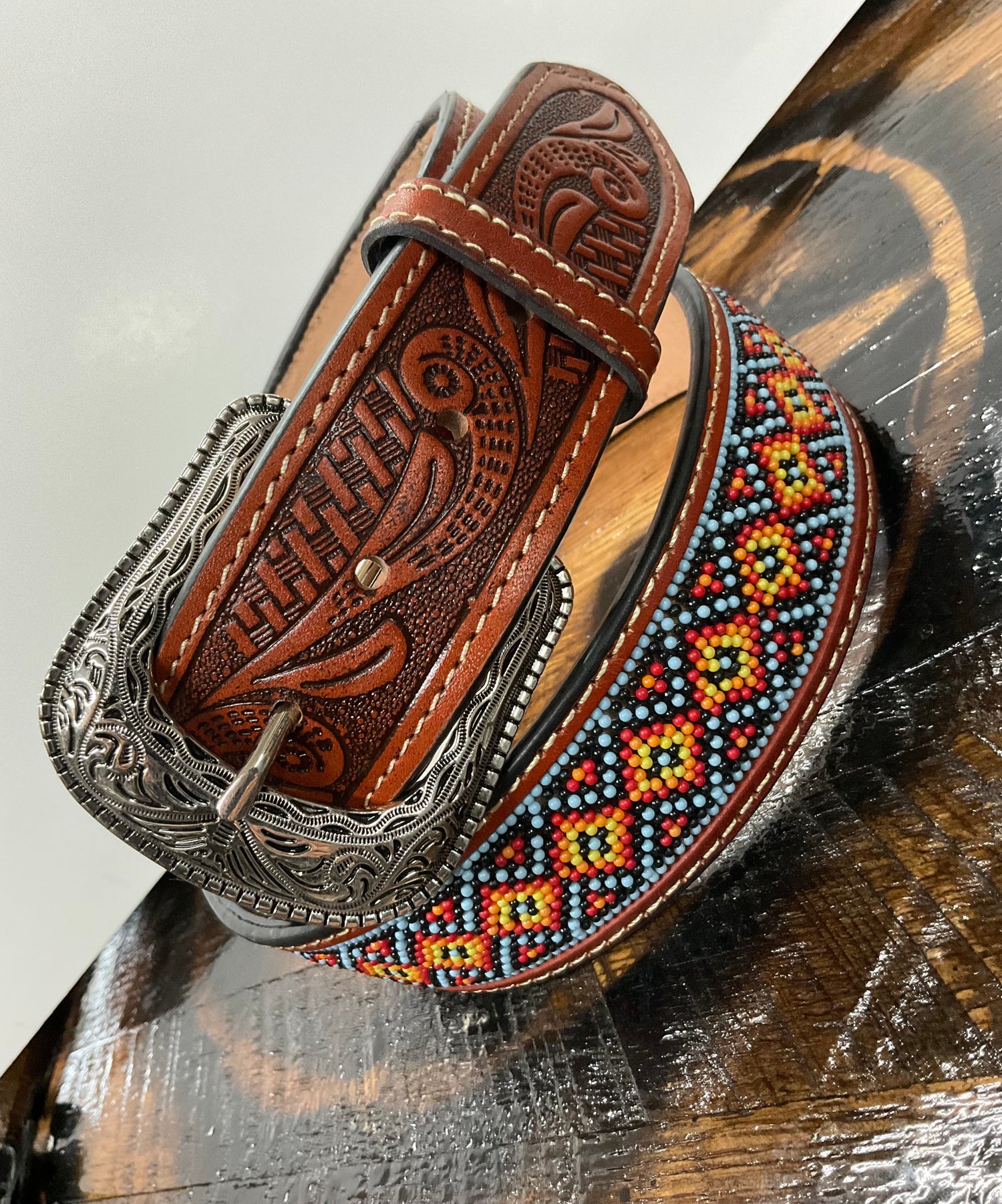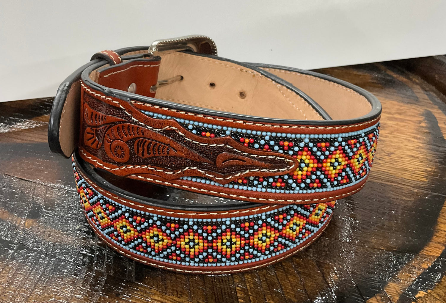 Brown leather belt with tooled floral accents and colorful hand-beaded pattern. A unique mix of western and artisan style.