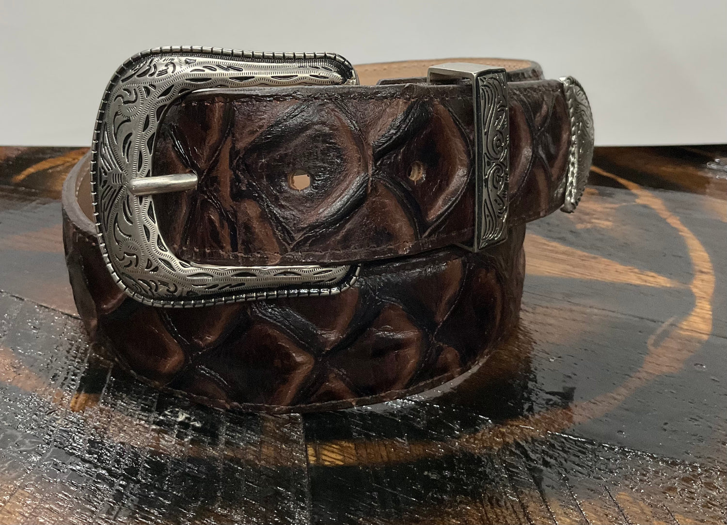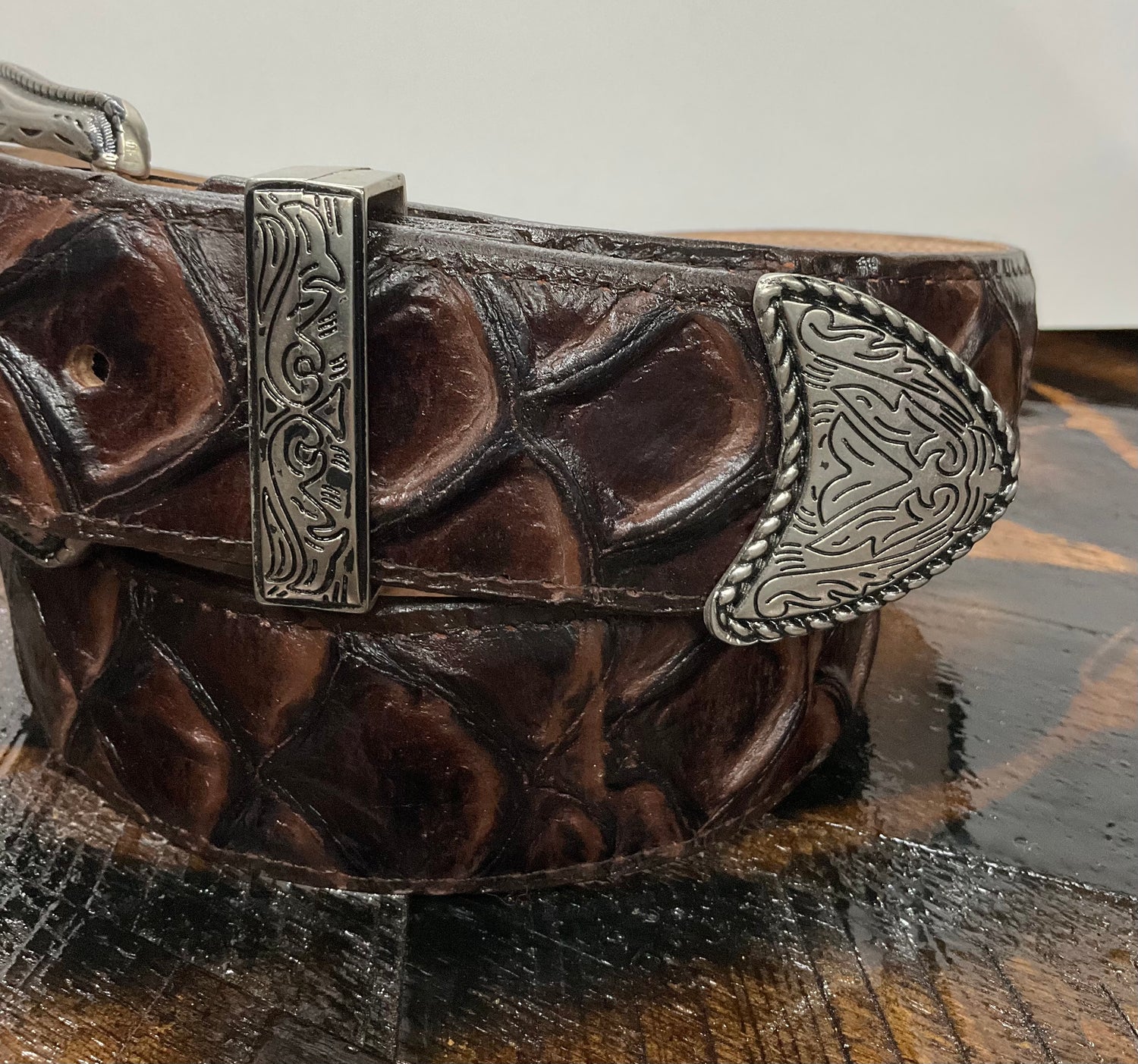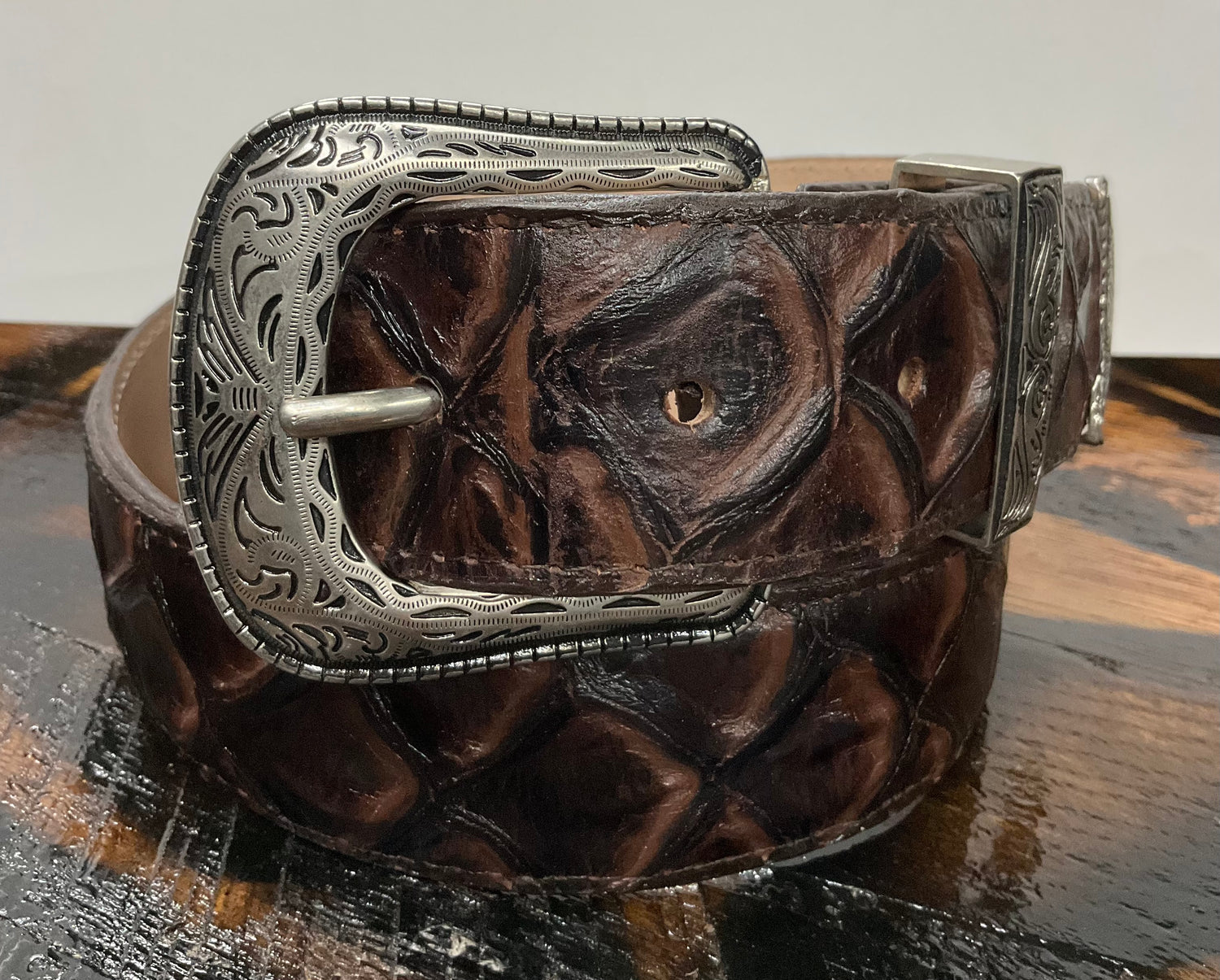 Brown leather belt with fish-scale imitation texture and engraved buckle. Handmade in Mexico.