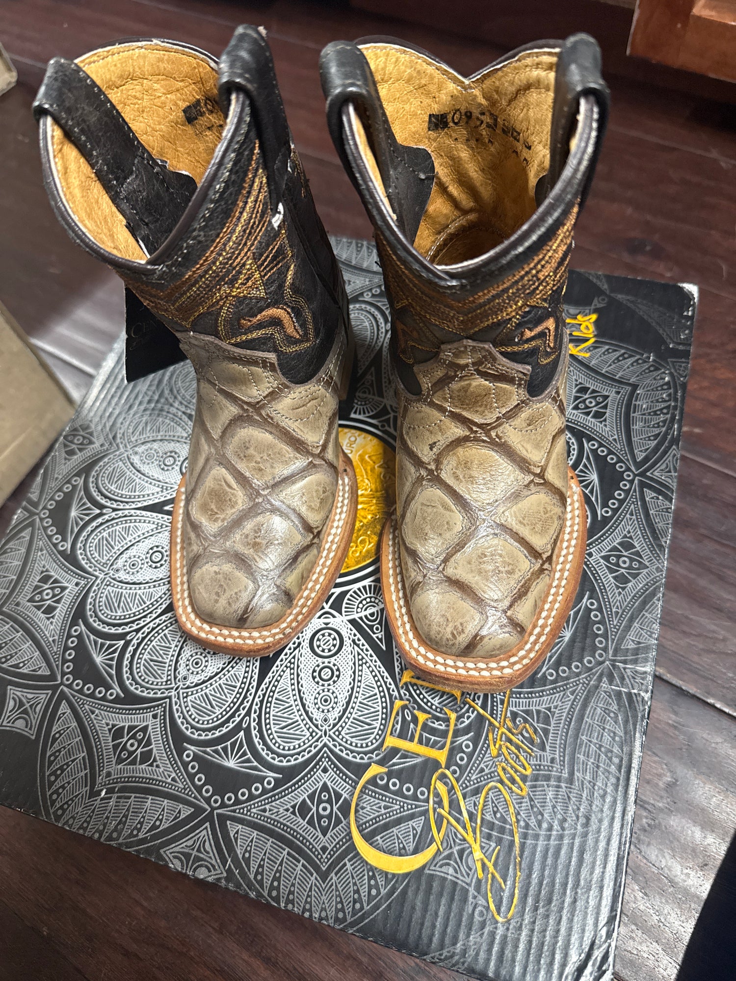 Estas elegantes botas Centenario para niños presentan un llamativo estampado de pescado en el tubo combinado con piel rodeo orix en el pie. Diseñadas para brindar comodidad y durabilidad, cuentan con punta cuadrada, suela de cuero y tiradores laterales para ponerlas fácilmente. Perfectas para pequeños jinetes o amantes del estilo vaquero