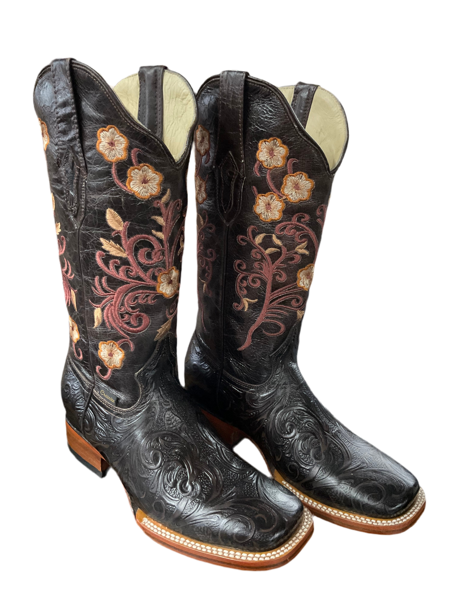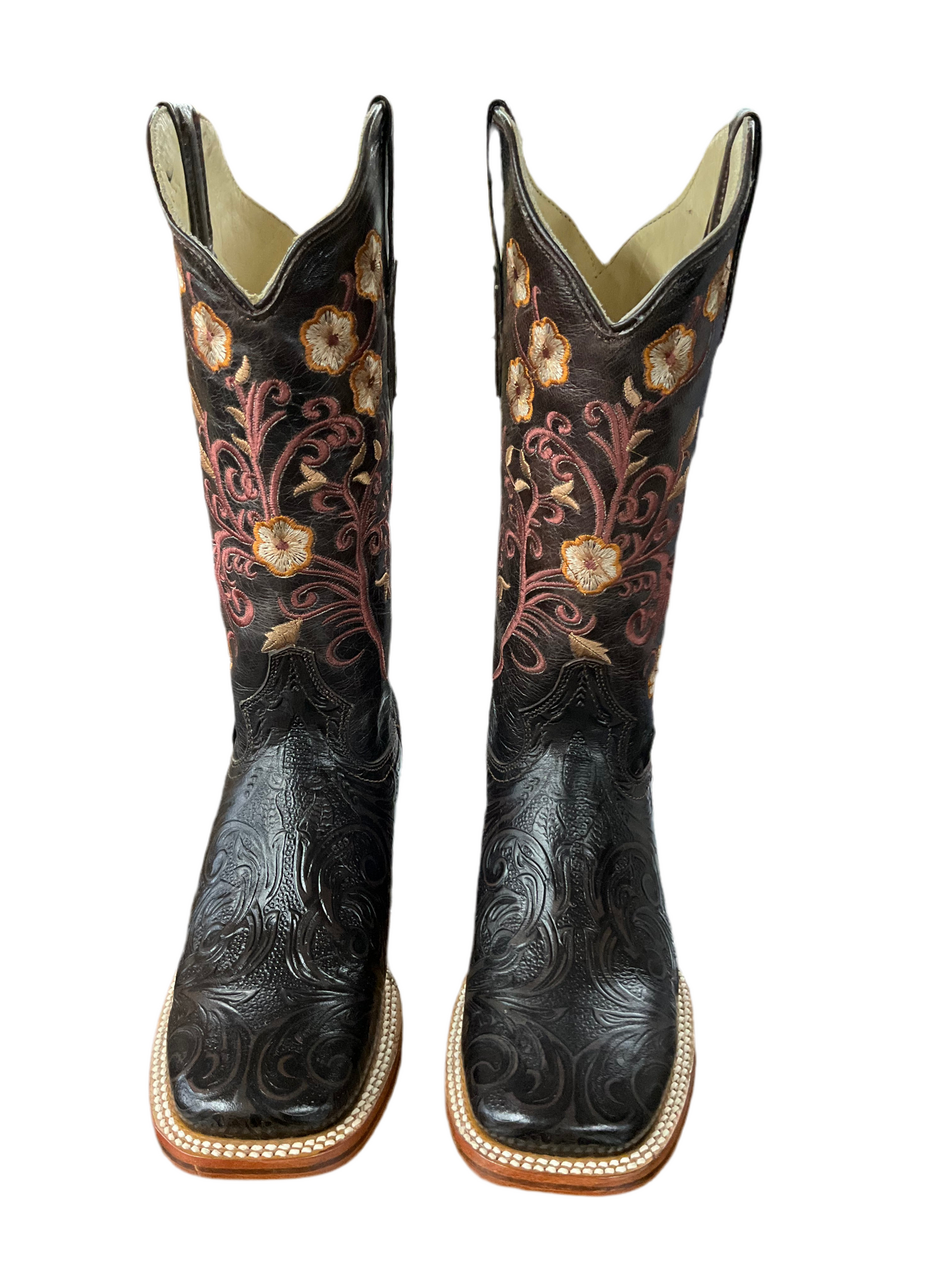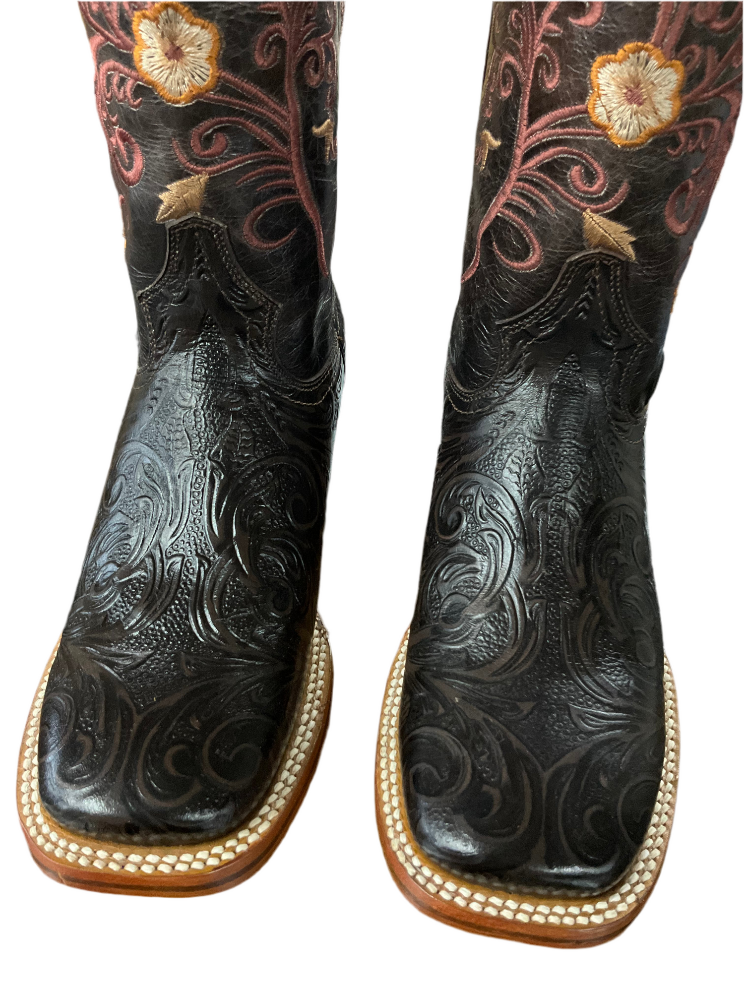 Elegant women’s western boots in embossed blackcherry leather with intricate floral embroidery in pink, yellow, and beige. Features a wide square toe and double-stitched welt for a bold, stylish finish.