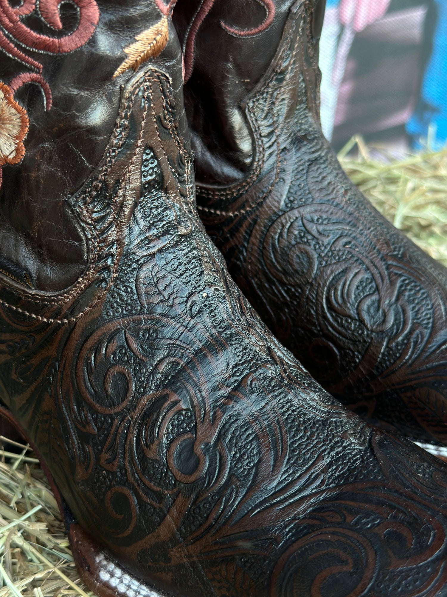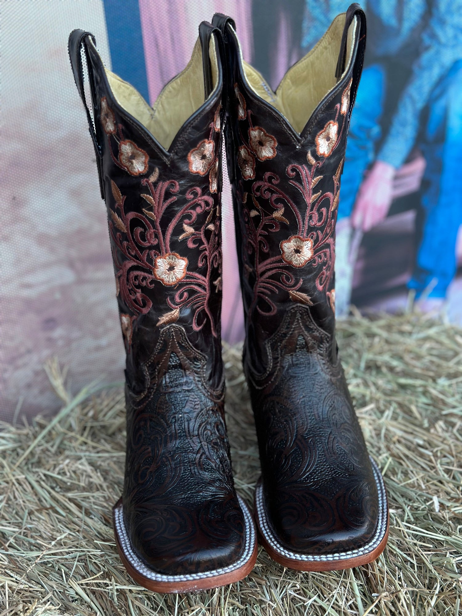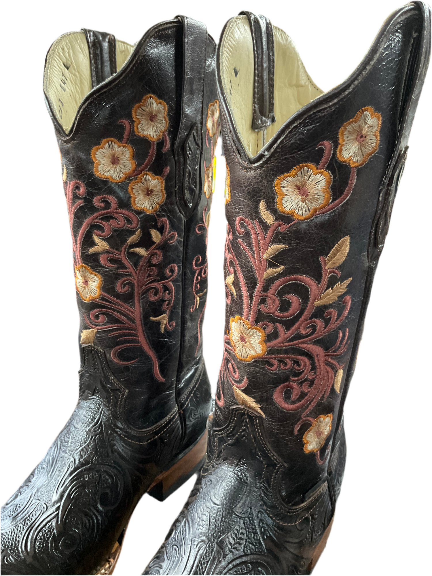 Elegant women’s western boots in embossed blackcherry leather with intricate floral embroidery in pink, yellow, and beige. Features a wide square toe and double-stitched welt for a bold, stylish finish.