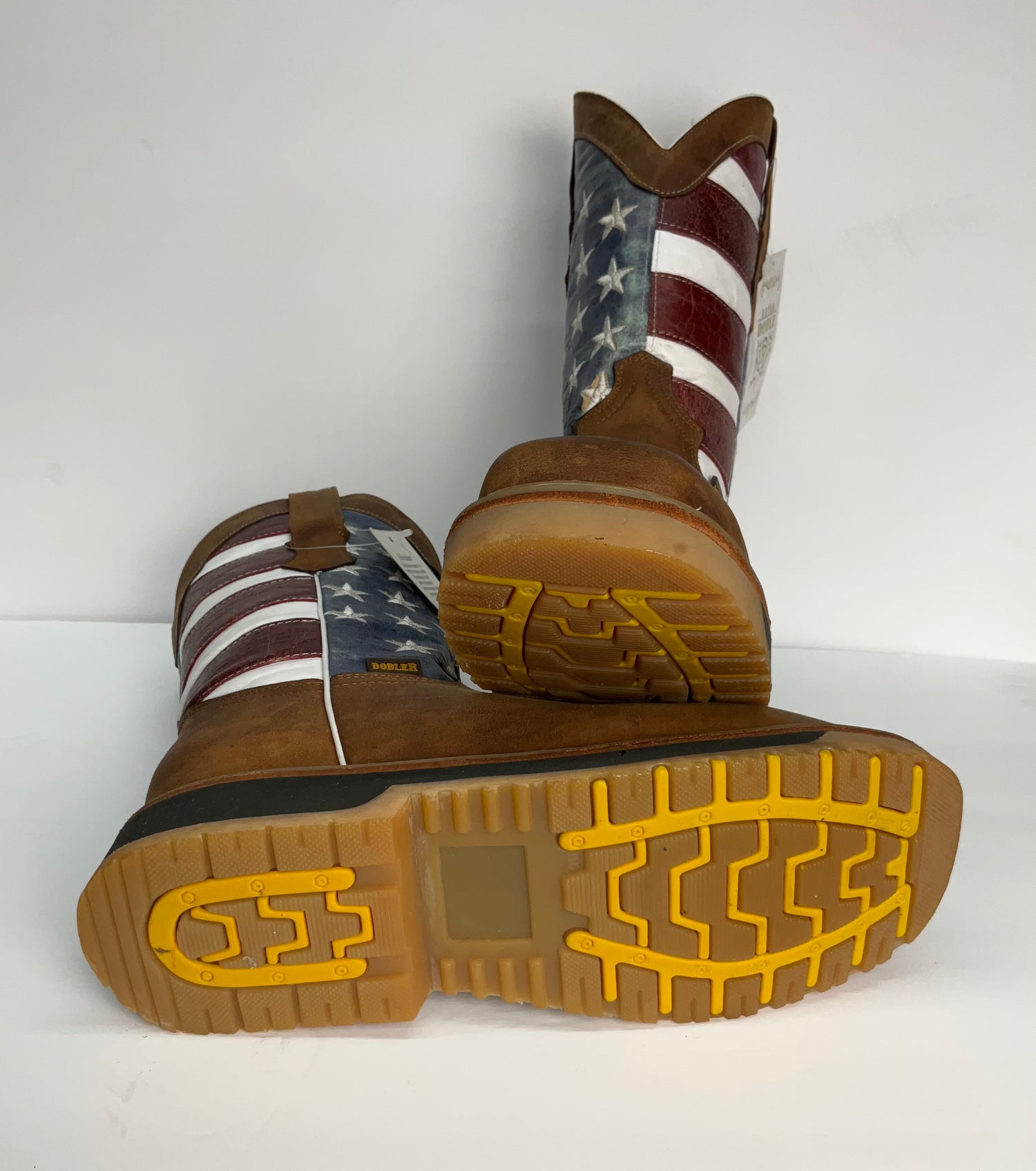 Stand out with these brown leather boots featuring the American flag shaft. Durable, bold, and full of Western pride.