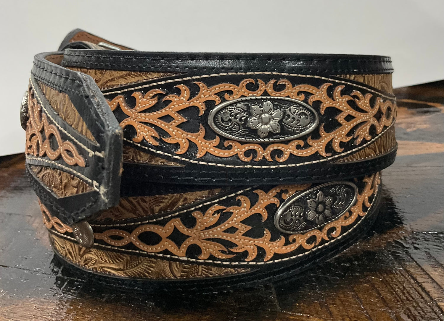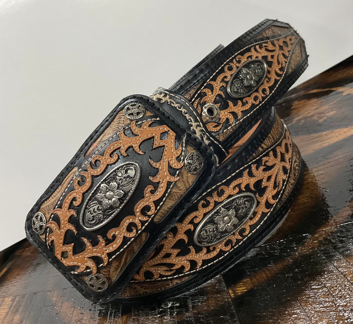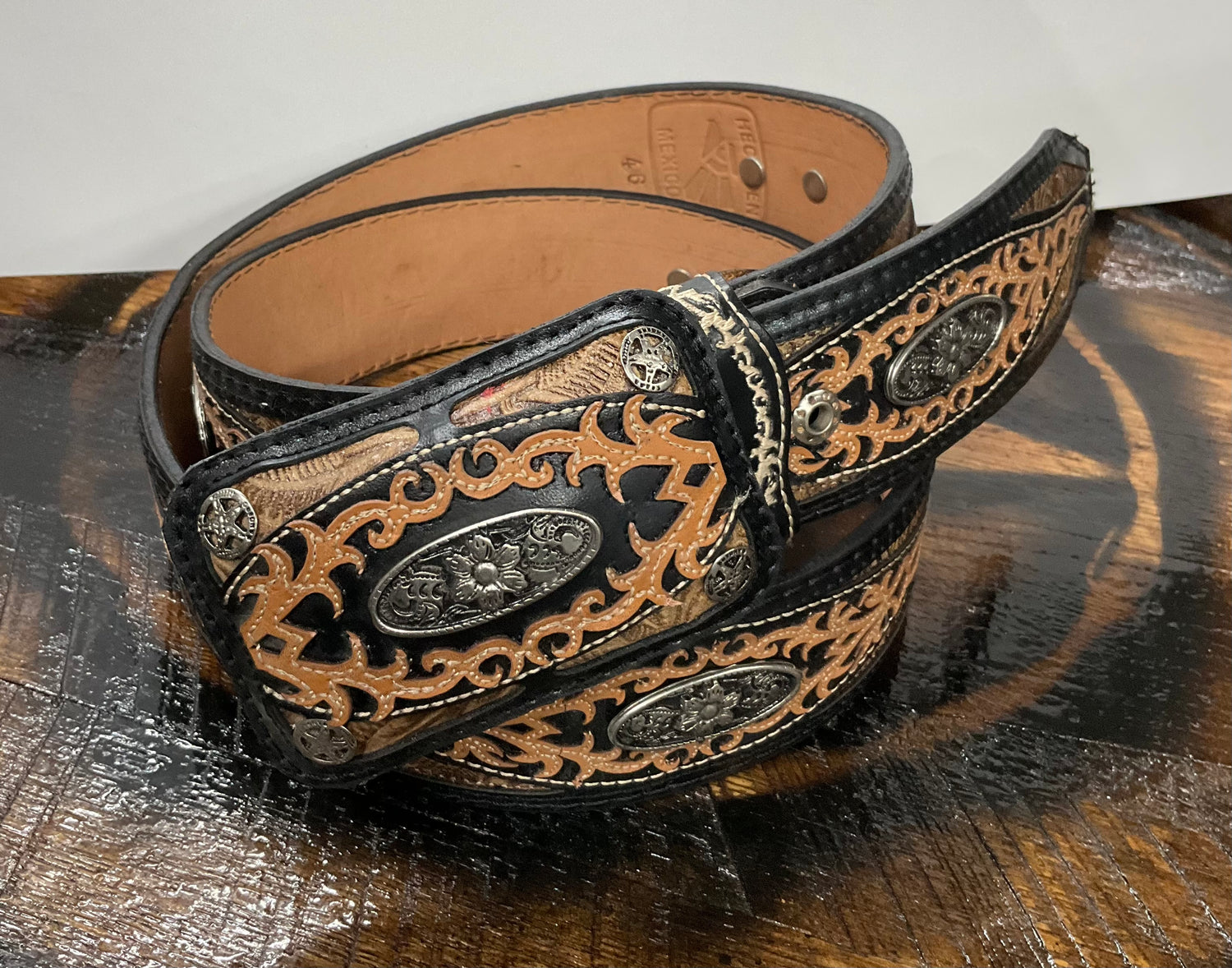 Cinto vaquero de piel con grabado de calavera y diseño labrado en tonos negro y miel.