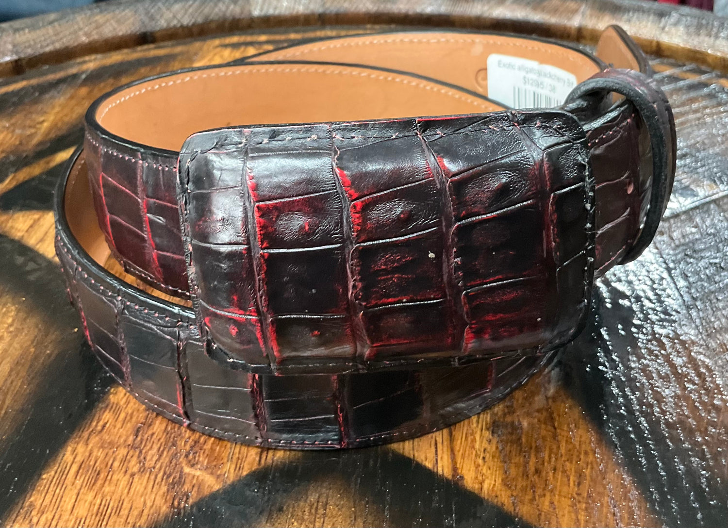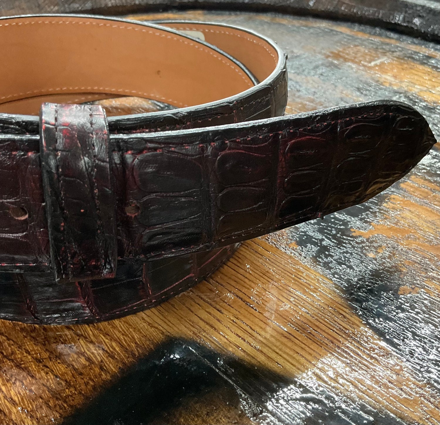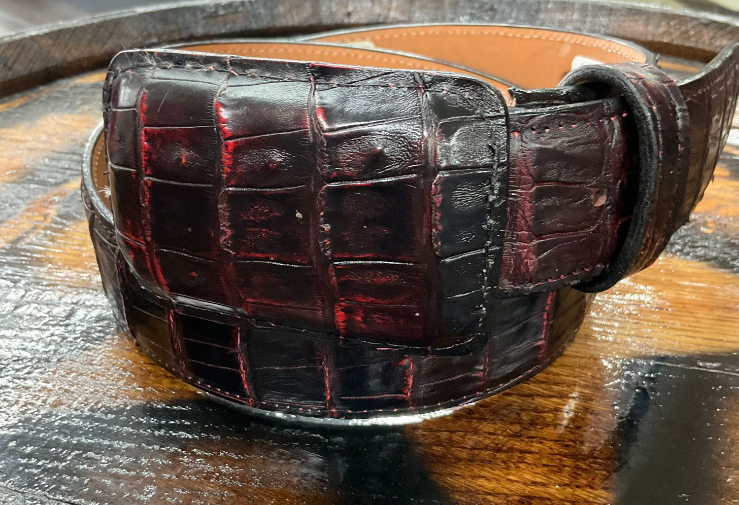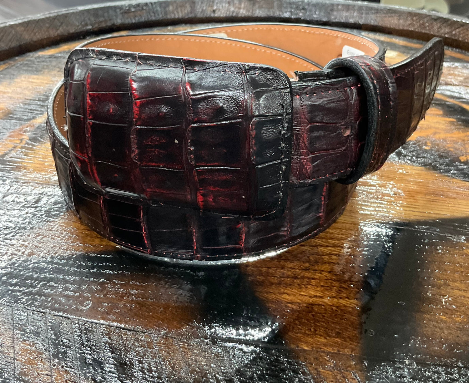 Exotic black cherry belts with bold alligator-style texture and square tip. A luxurious and eye-catching Western essential.