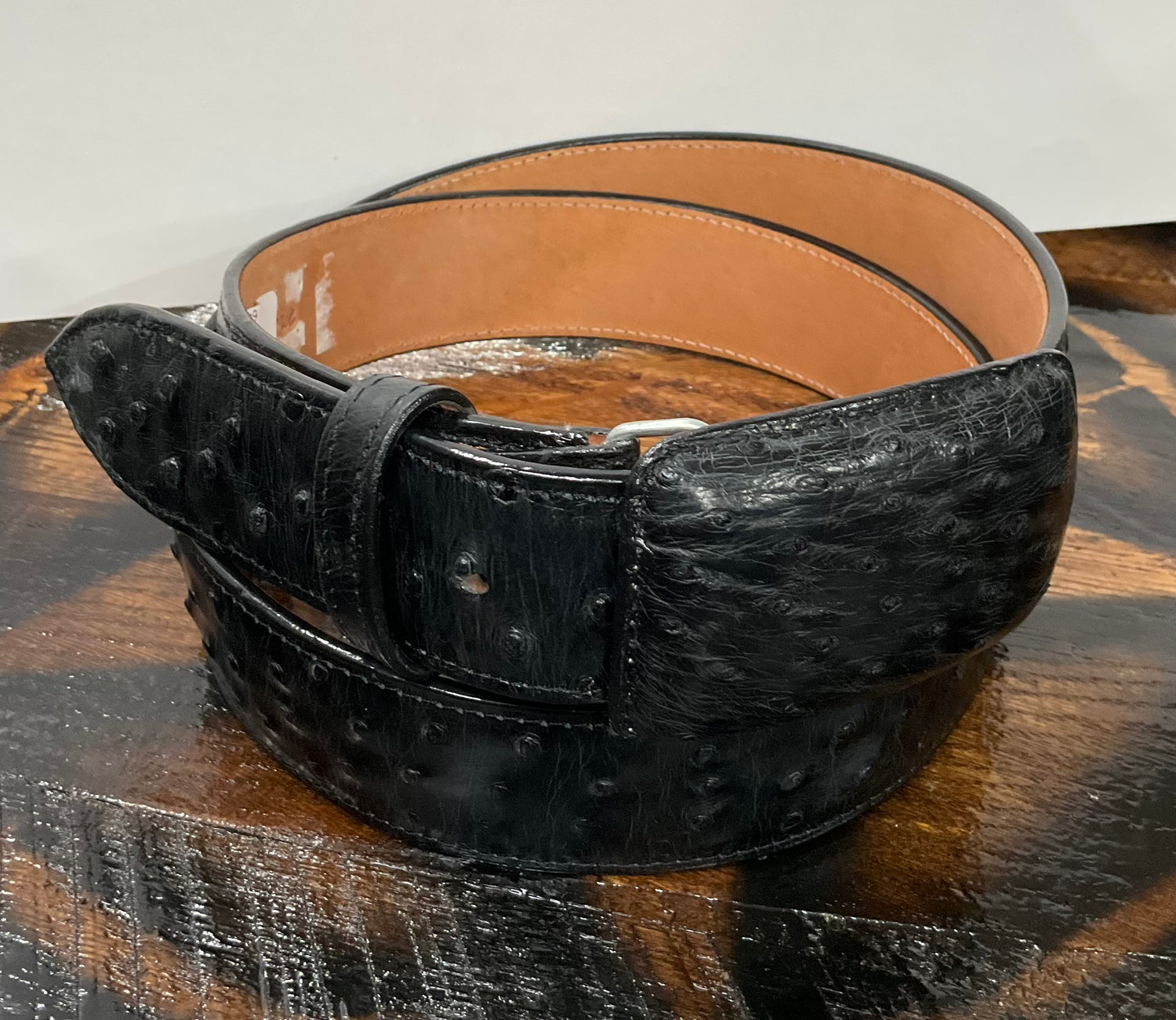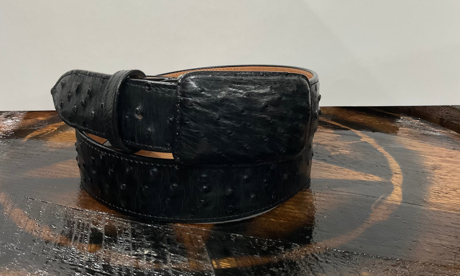 Genuine black ostrich leather belt with matching covered buckle. A premium exotic piece for true Western style.