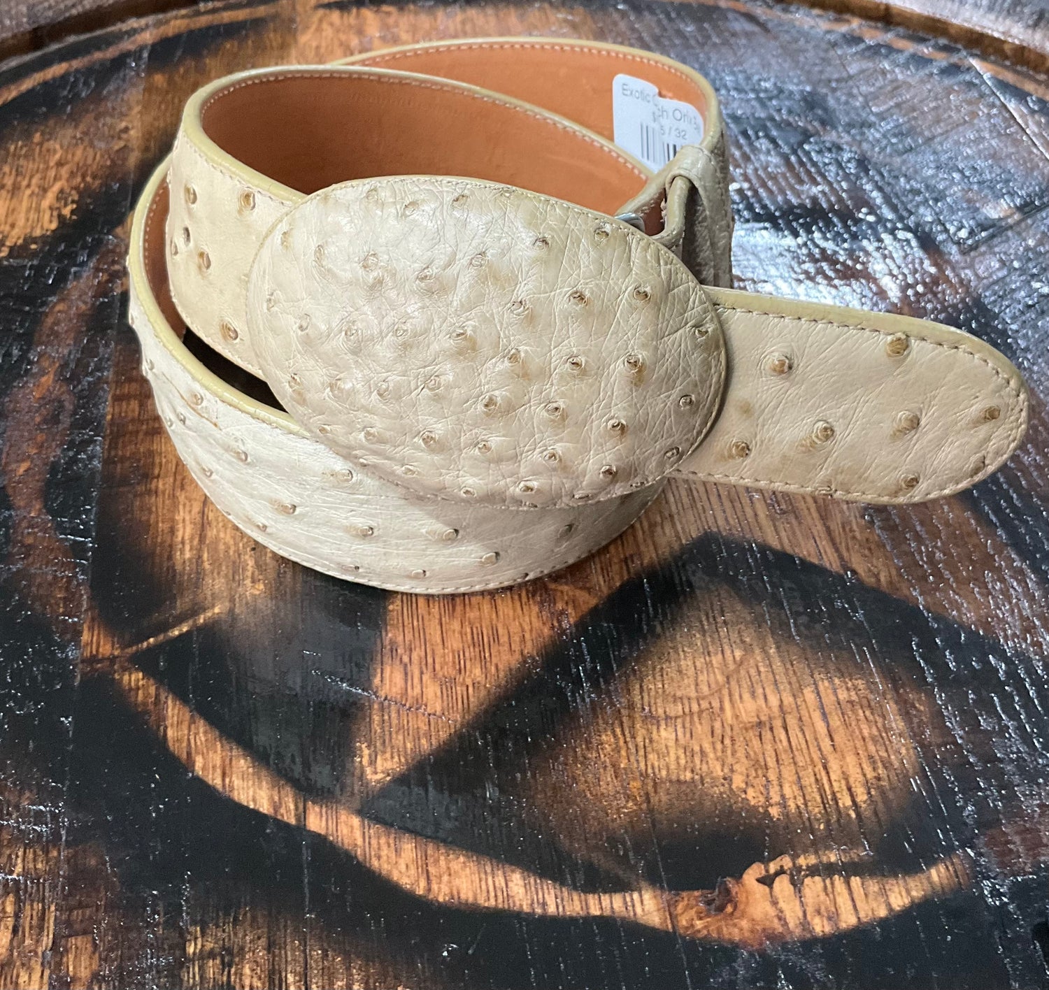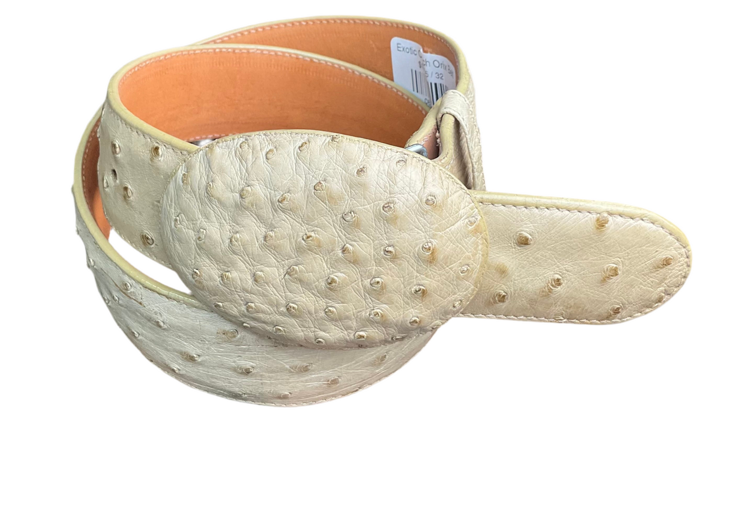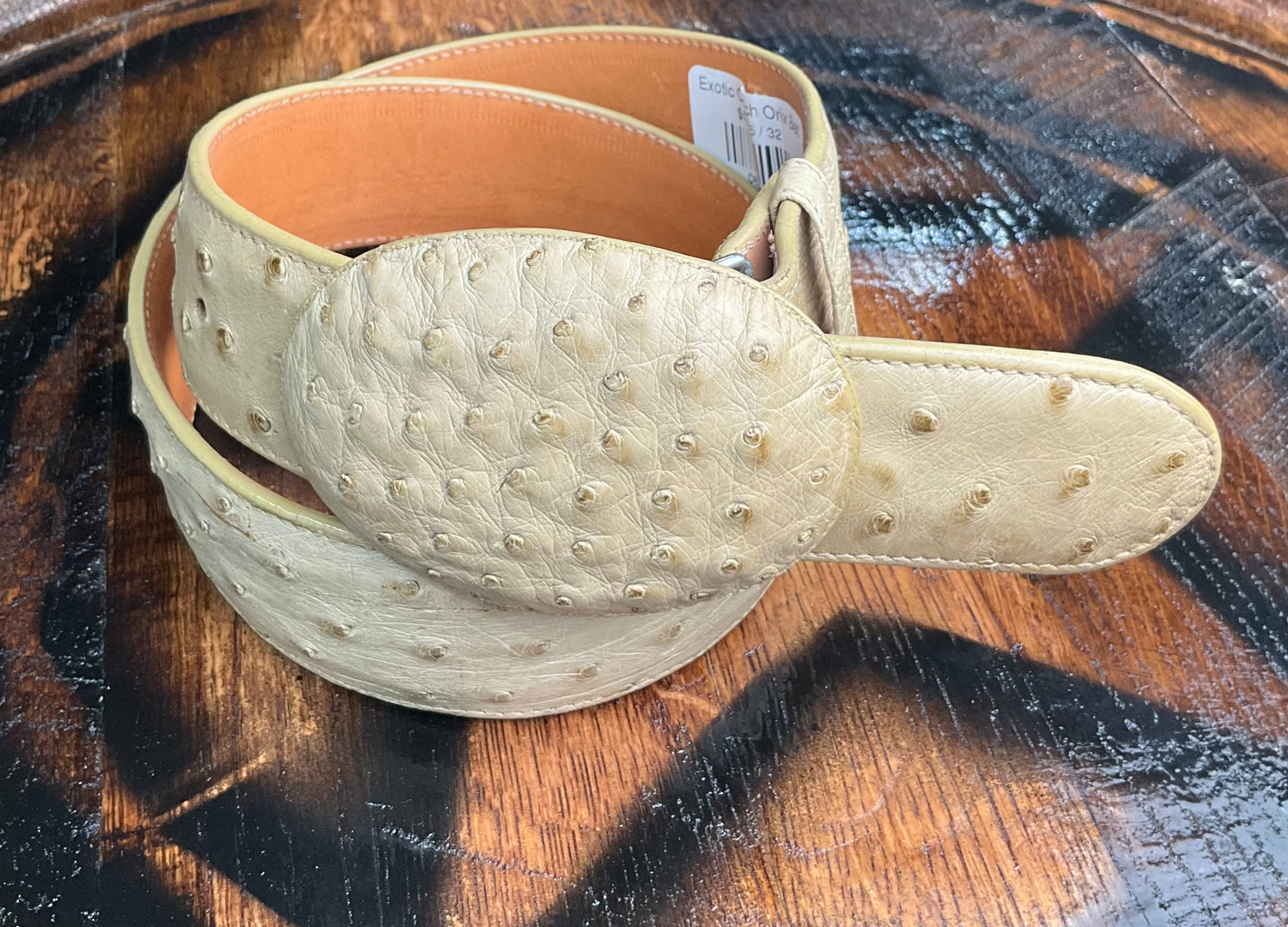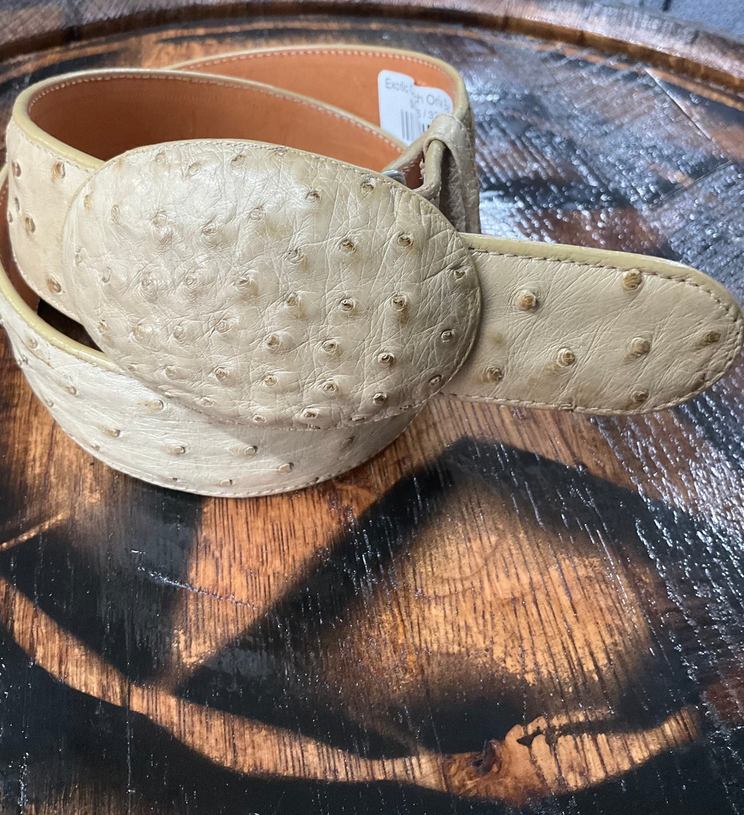 Original ostrich belt in oryx color with round tip. Soft texture and natural look—a timeless piece of Western elegance.