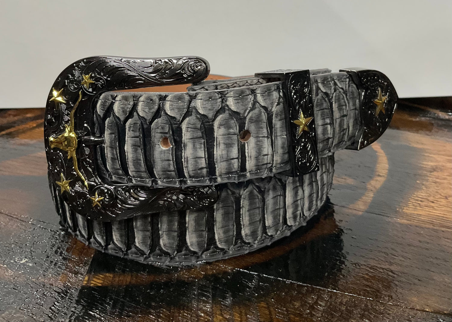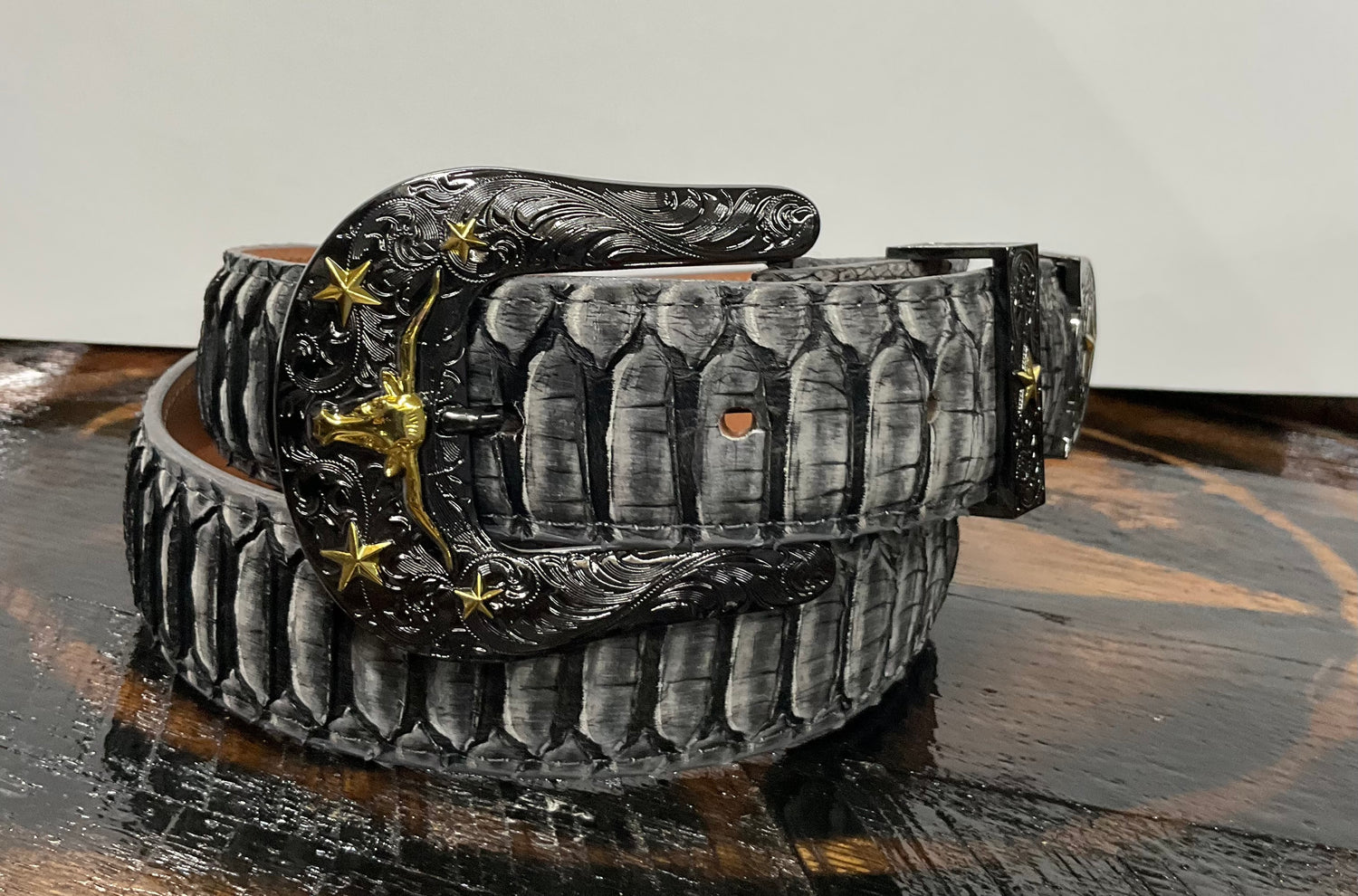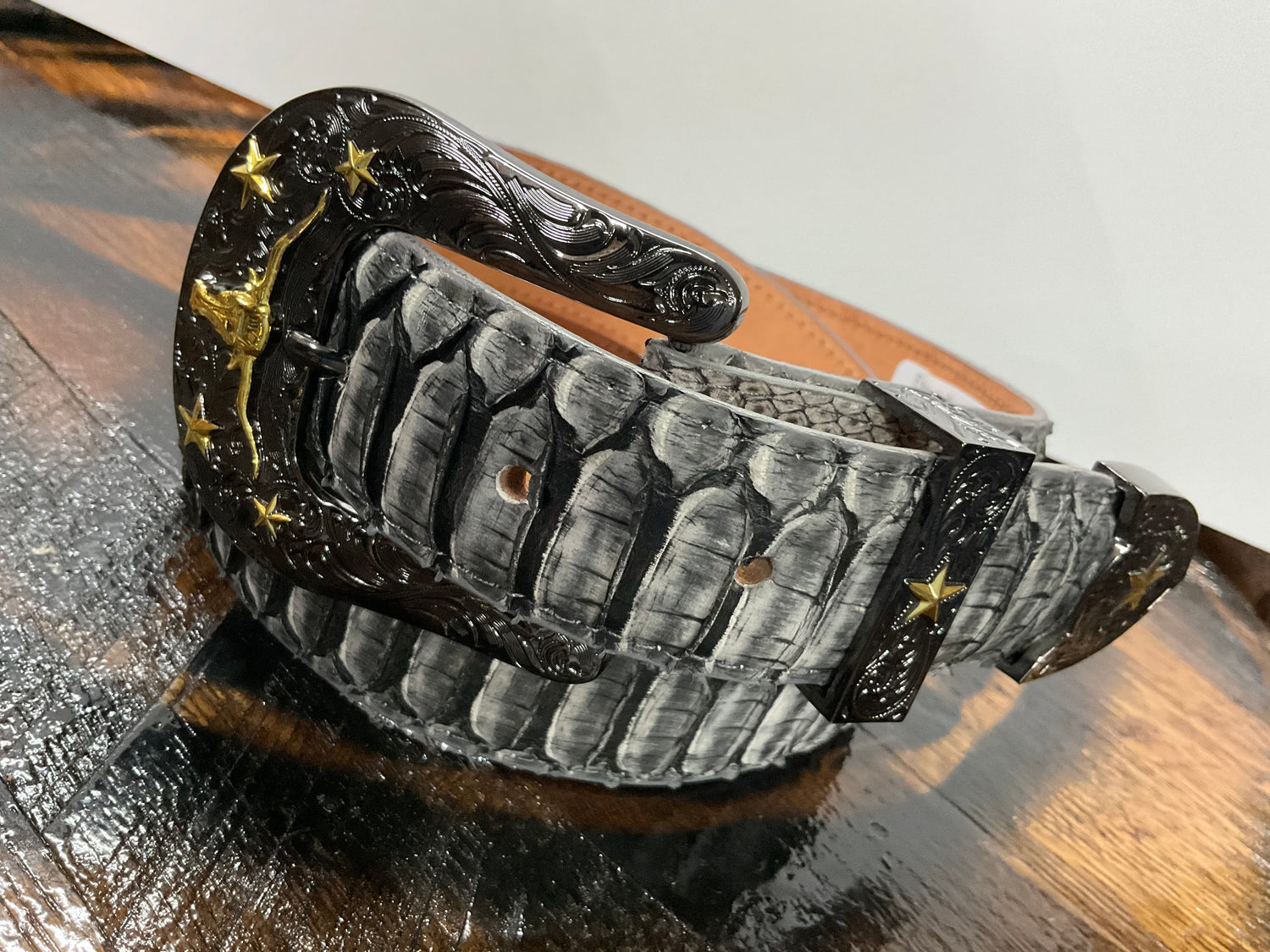 Men’s exotic-style python belt in grey. Features a striking silver buckle with floral engravings and a gold star accent. Bold, stylish, and full of Western attitude.