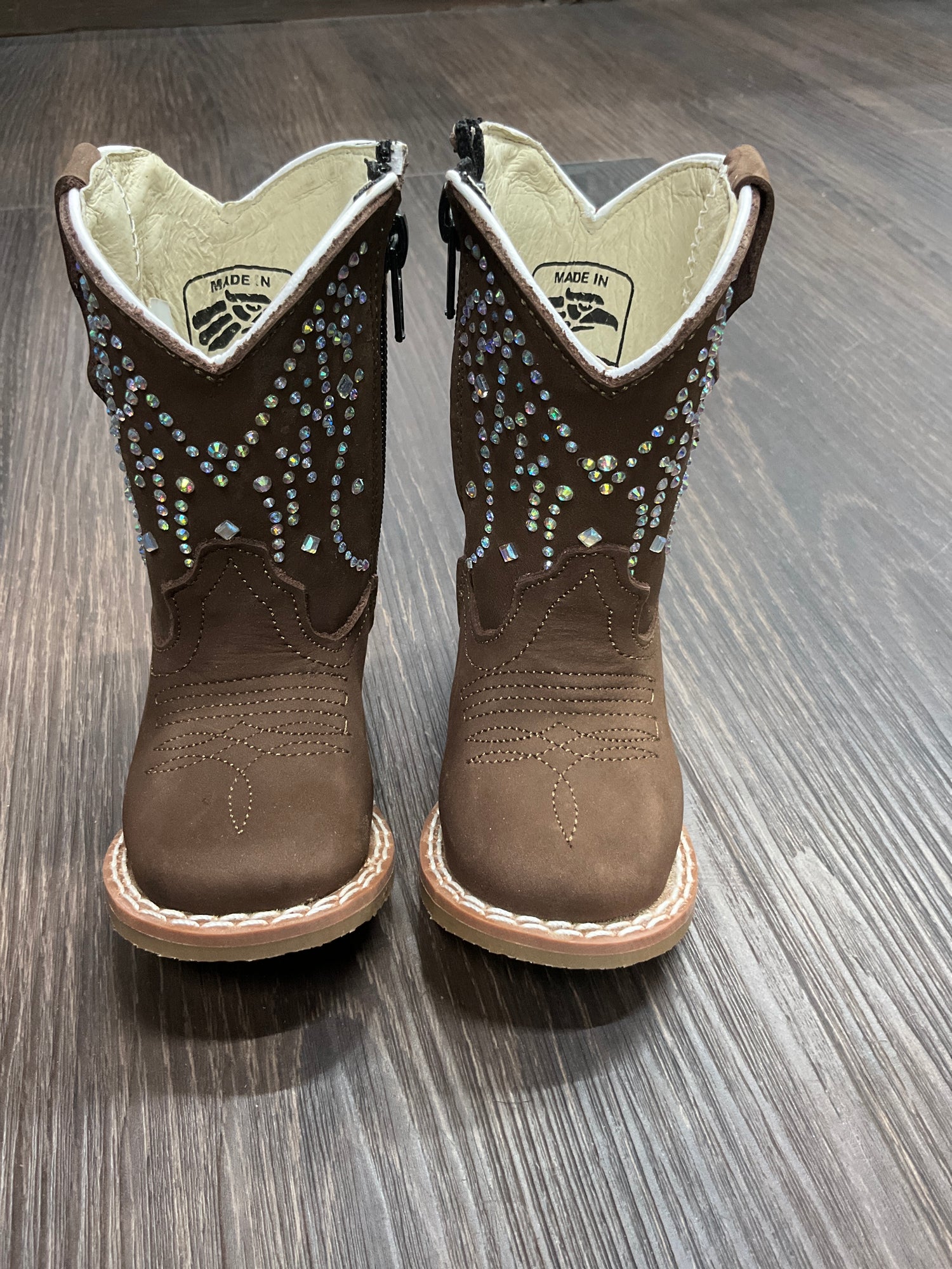 Botitas de niña en piel nobuck color café con detalles de brillantes, cierre lateral (zipper) y suela cosida para mayor durabilidad.