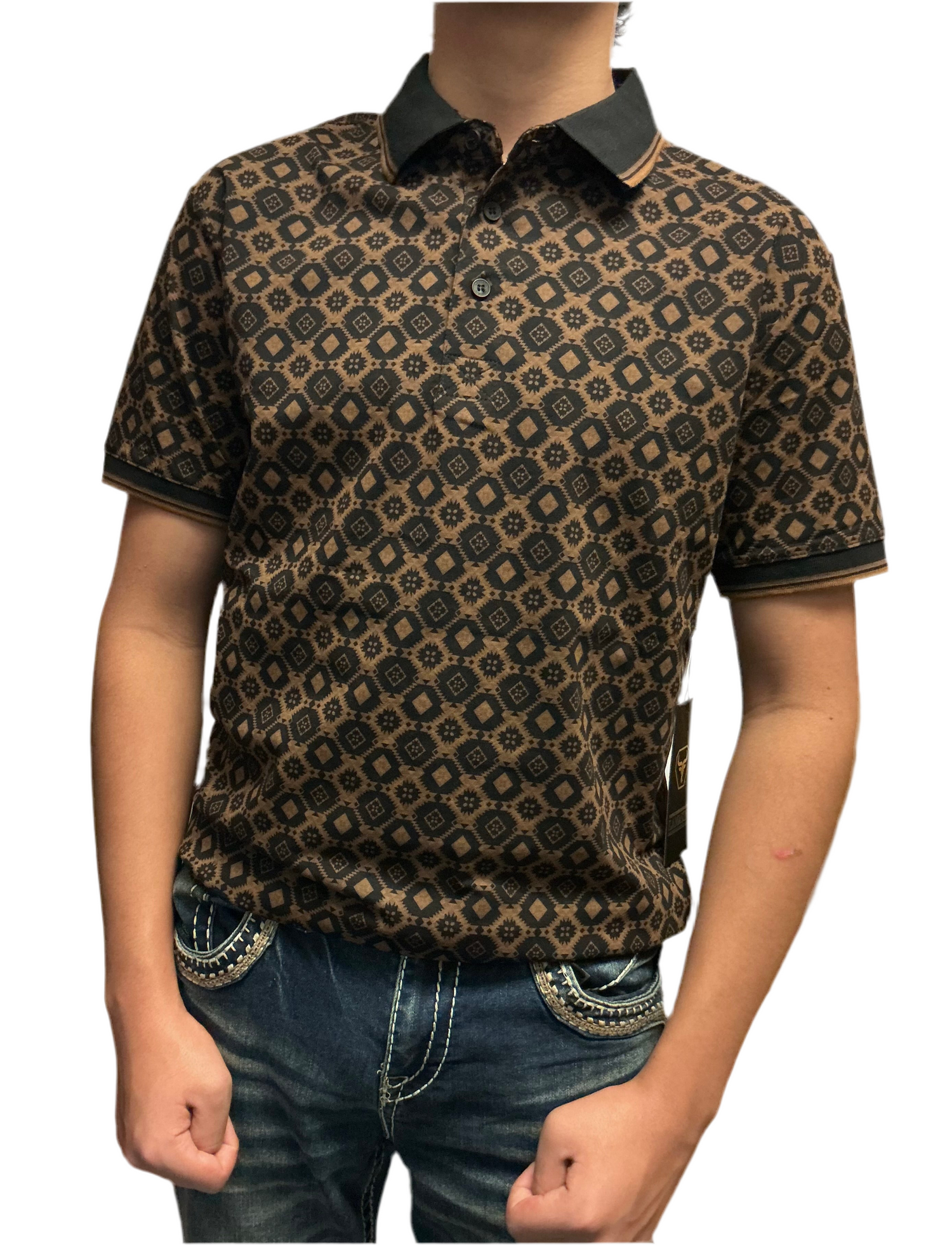 Polo de hombre Lamasini LAM28224 en negro con estampado geométrico café claro. Corte moderno, confeccionado en 73% algodón y 27% poliéster para mayor comodidad y resistencia.