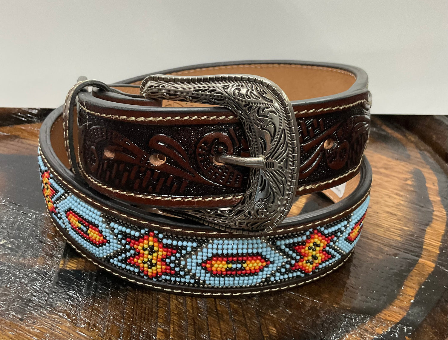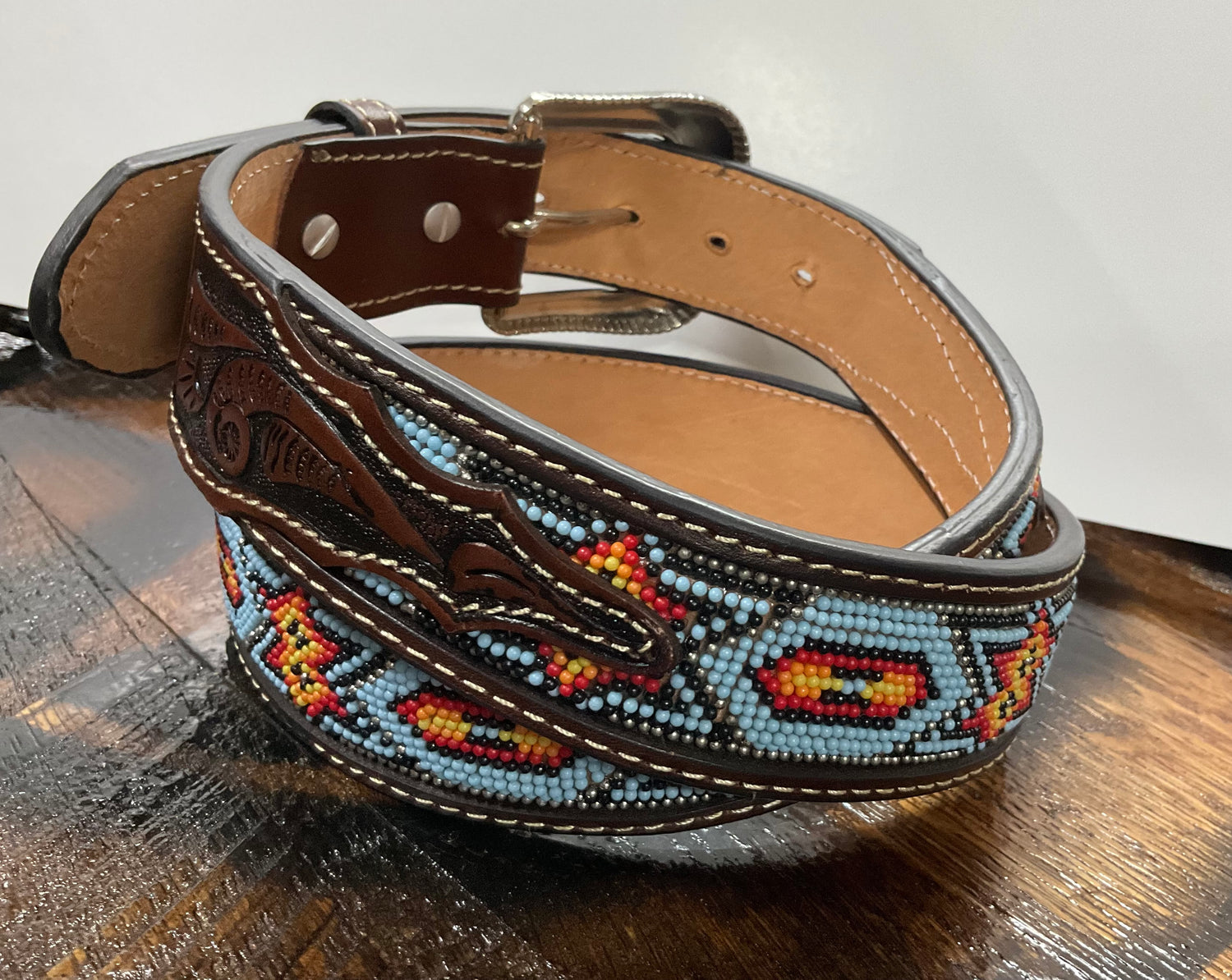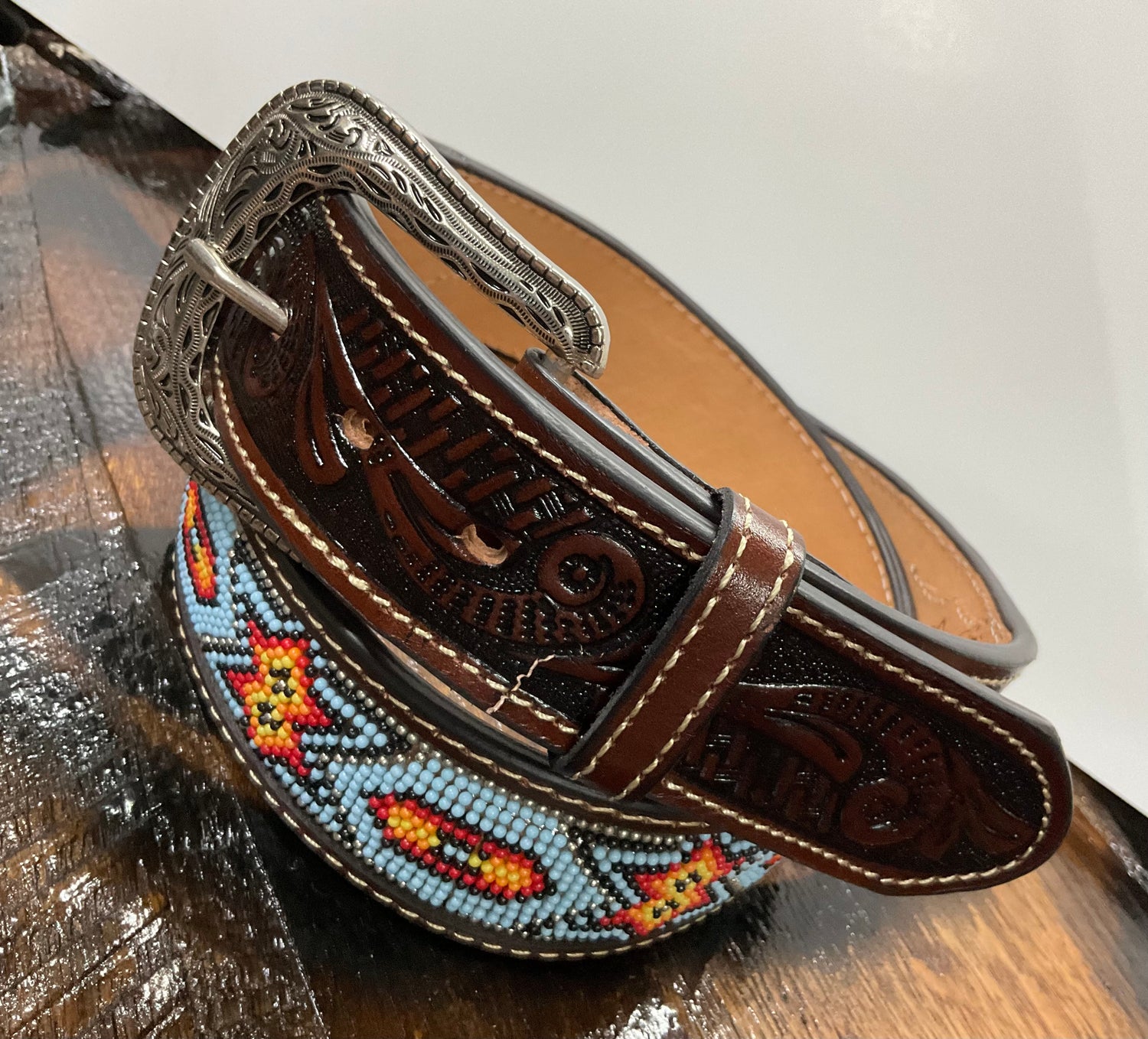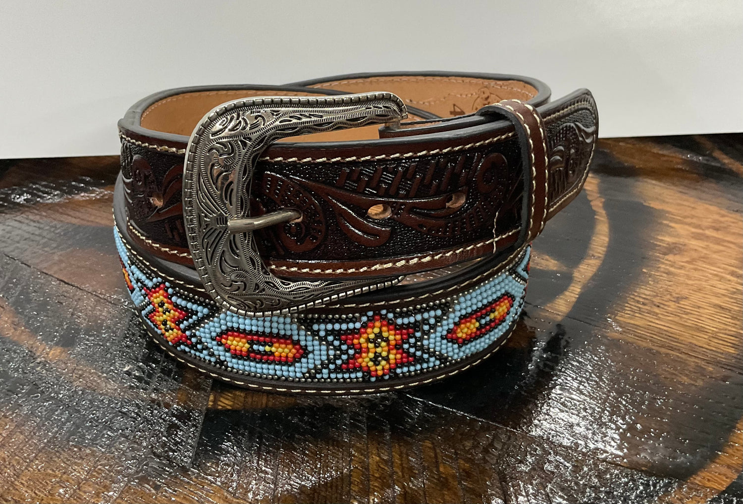 Handcrafted brown leather belt featuring intricate tooling and vibrant beaded patterns in red, yellow, blue, and white. A perfect blend of Western tradition and Native-inspired design.