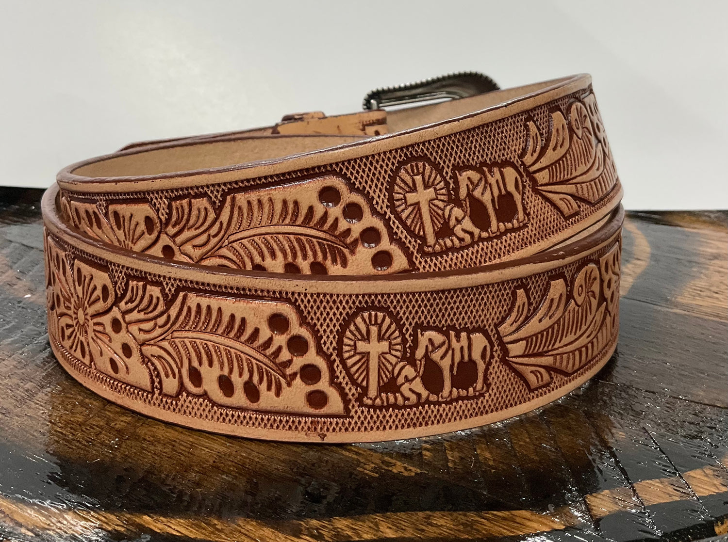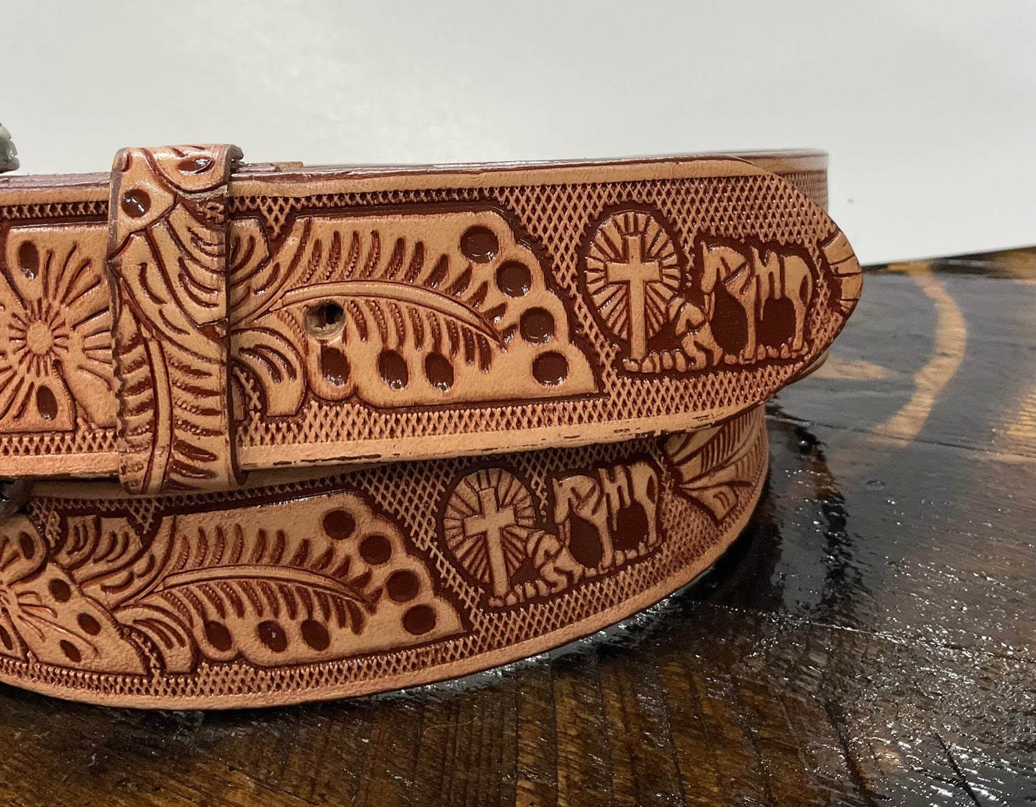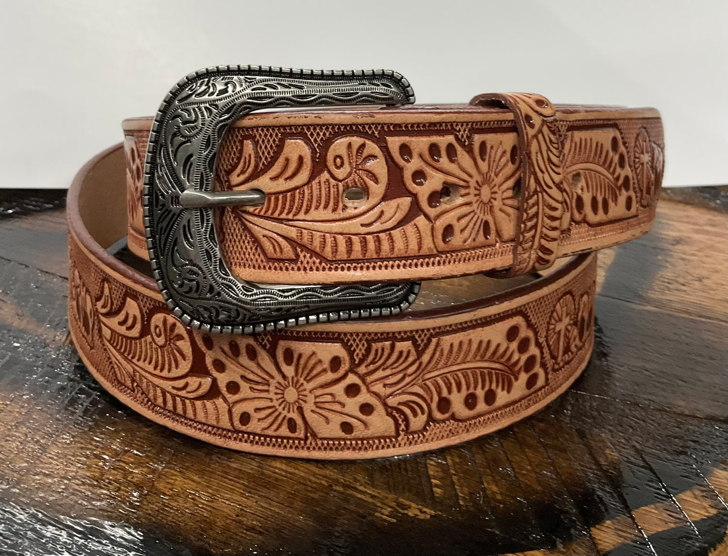 Natural tooled leather belt with floral design and engraved buckle. Unisex style, ideal for a clean and classic western look.
