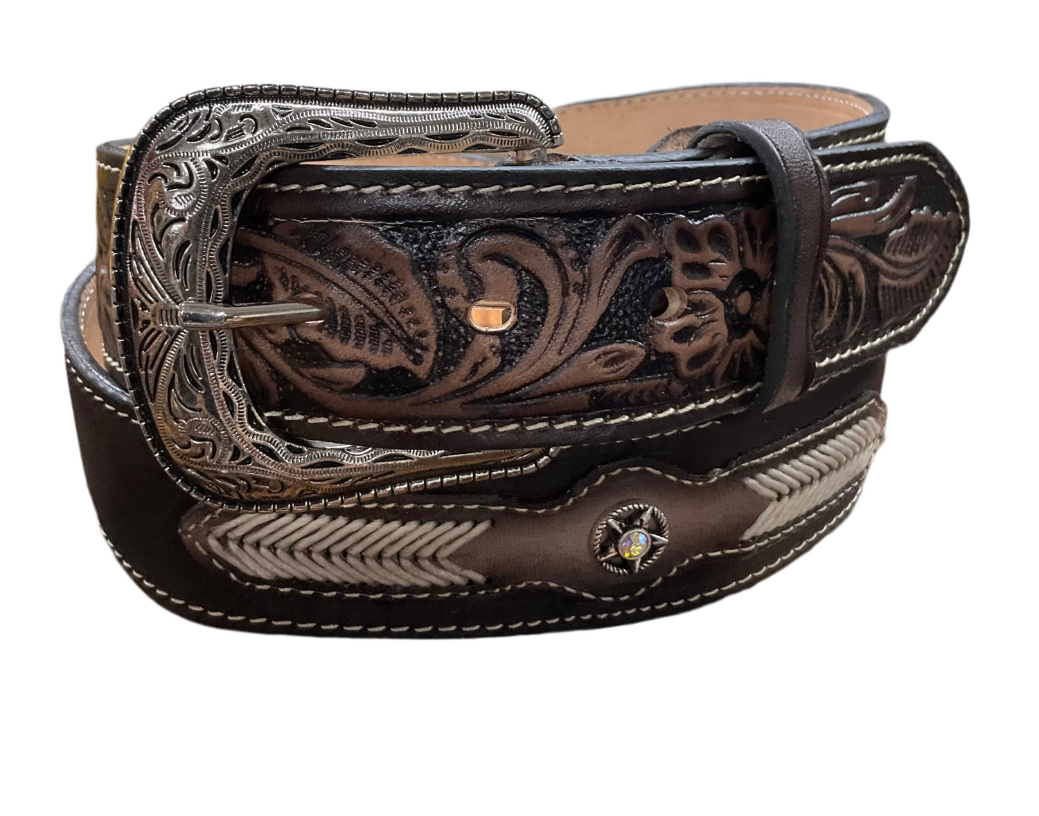 Cinto de gamuza café con conchos de estrella – estilo vaquero con un toque rústico y llamativo.