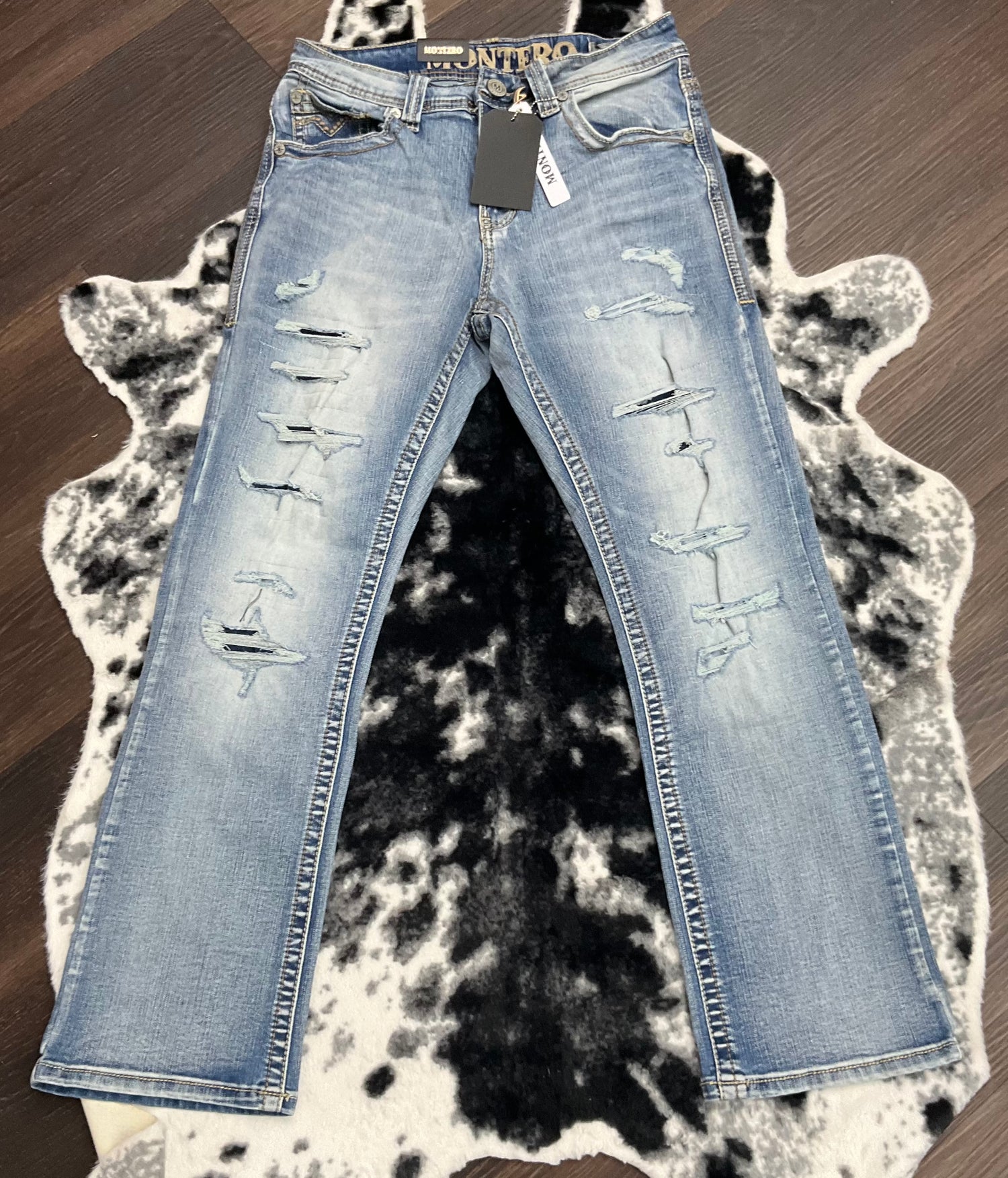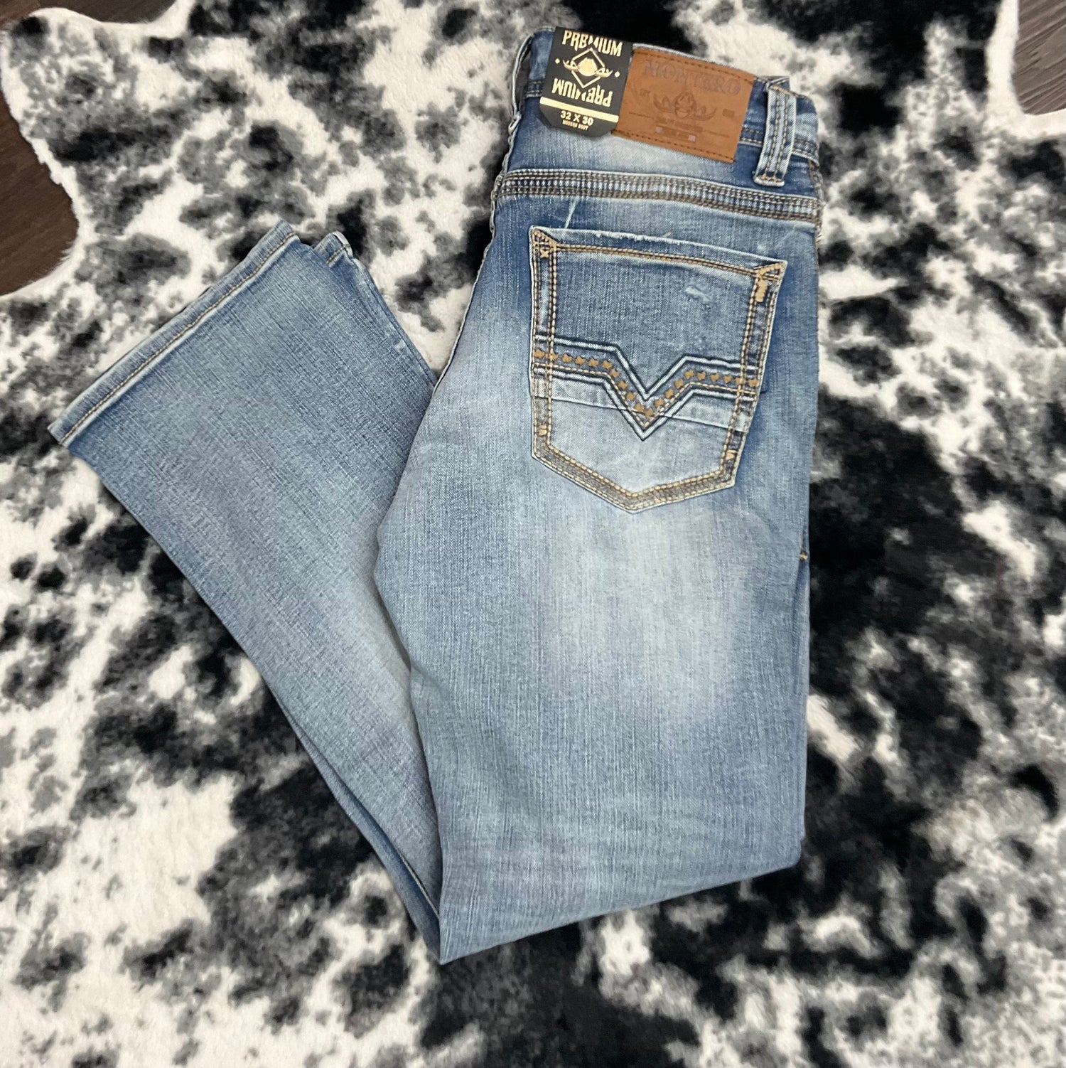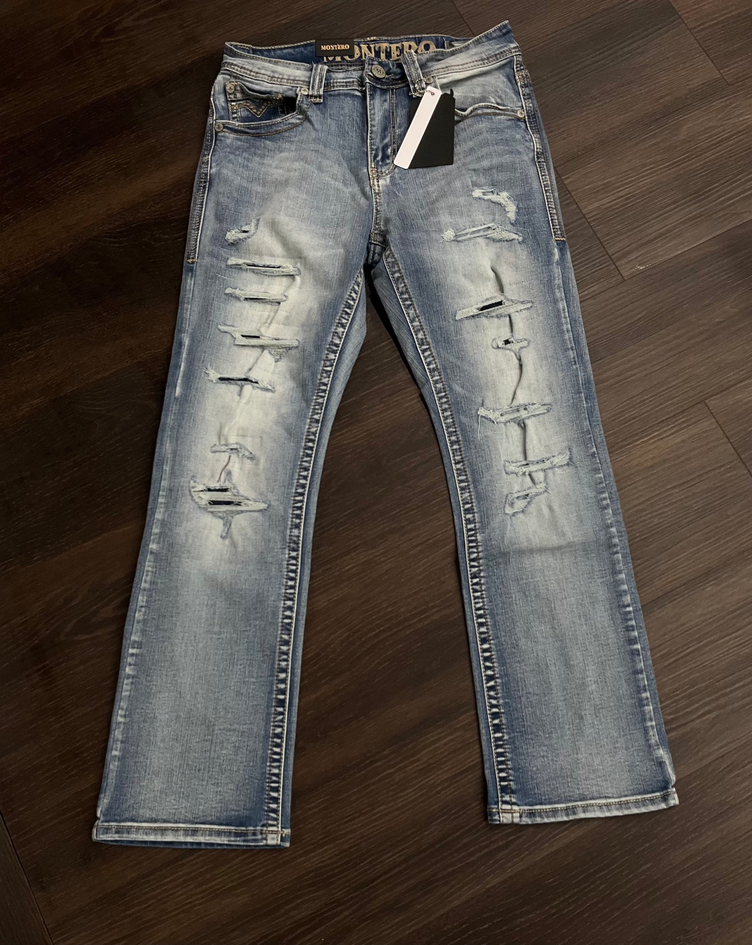 Jeans Montero Premium Collection con corte moderno boot cut, diseño rasgado al frente y bolsa trasera bordada. Estilo vaquero con comodidad.