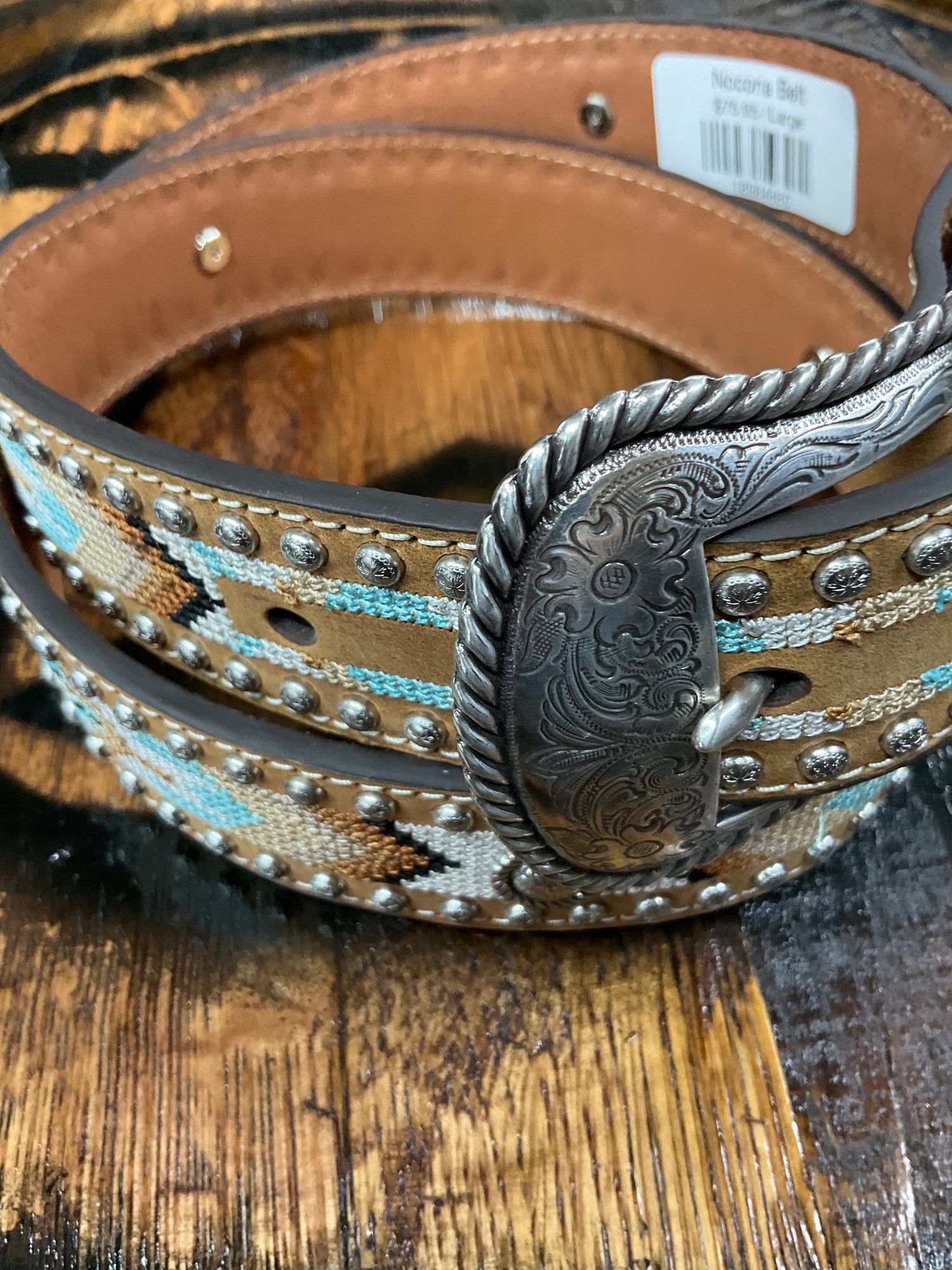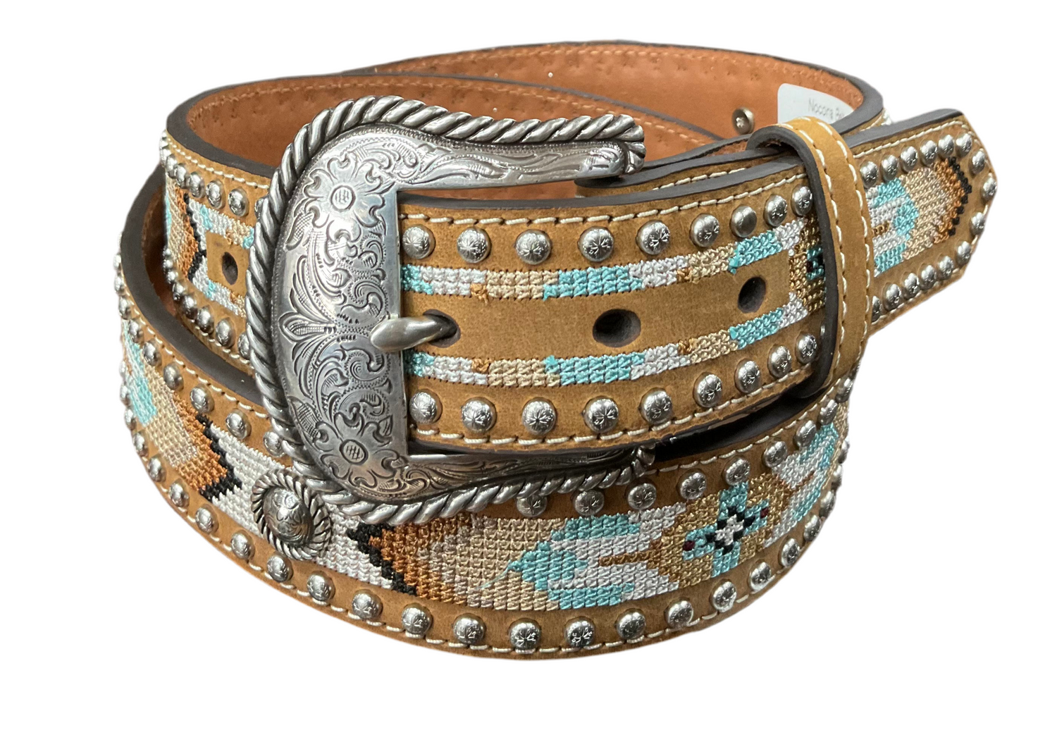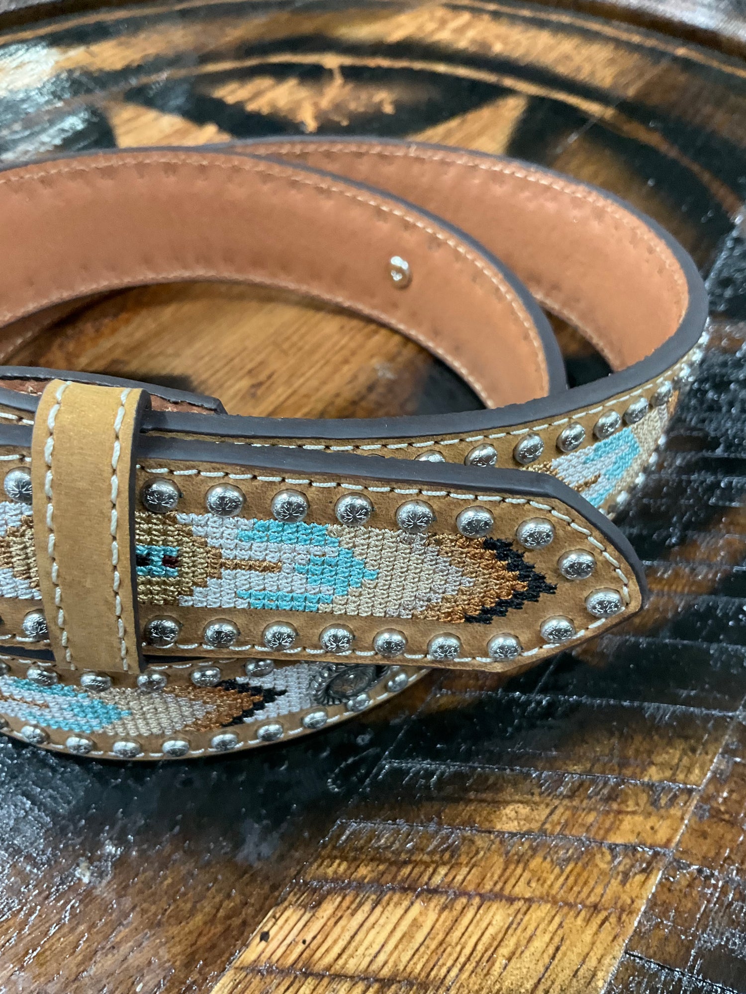 Western-style women’s belt with tan leather and beaded turquoise and brown Native-inspired pattern. Size S. Made in Taiwan.