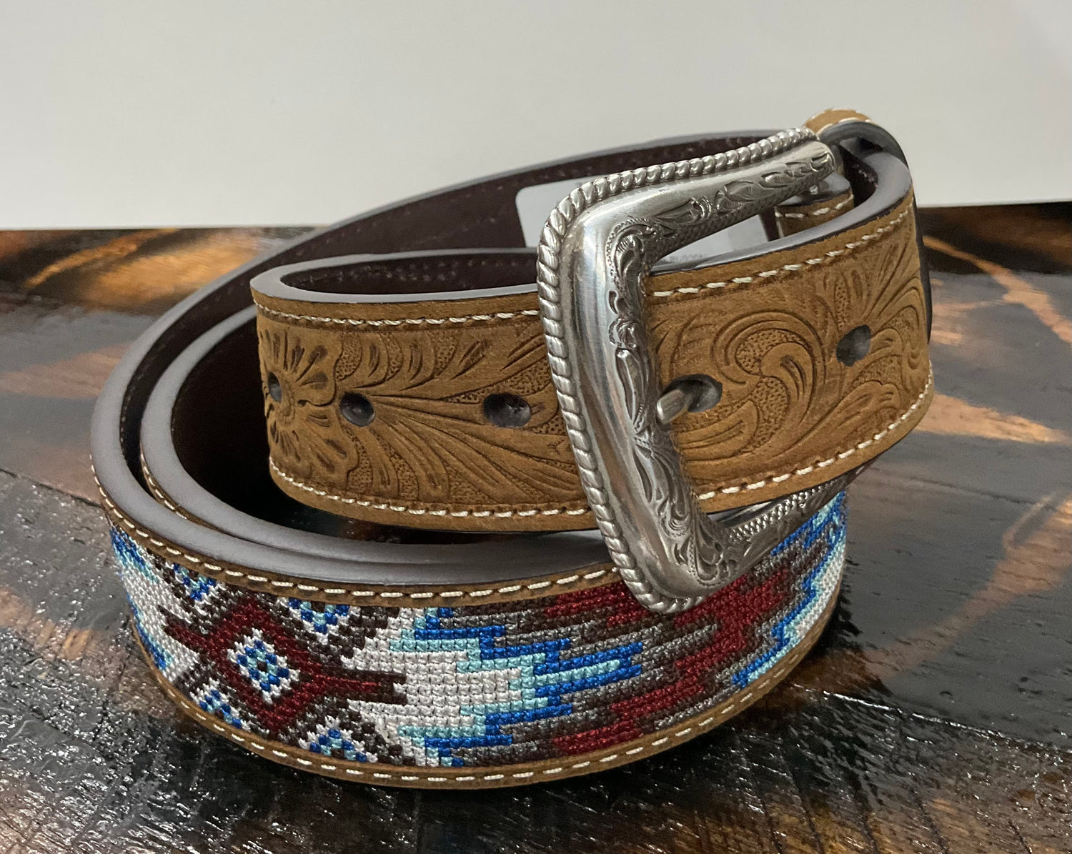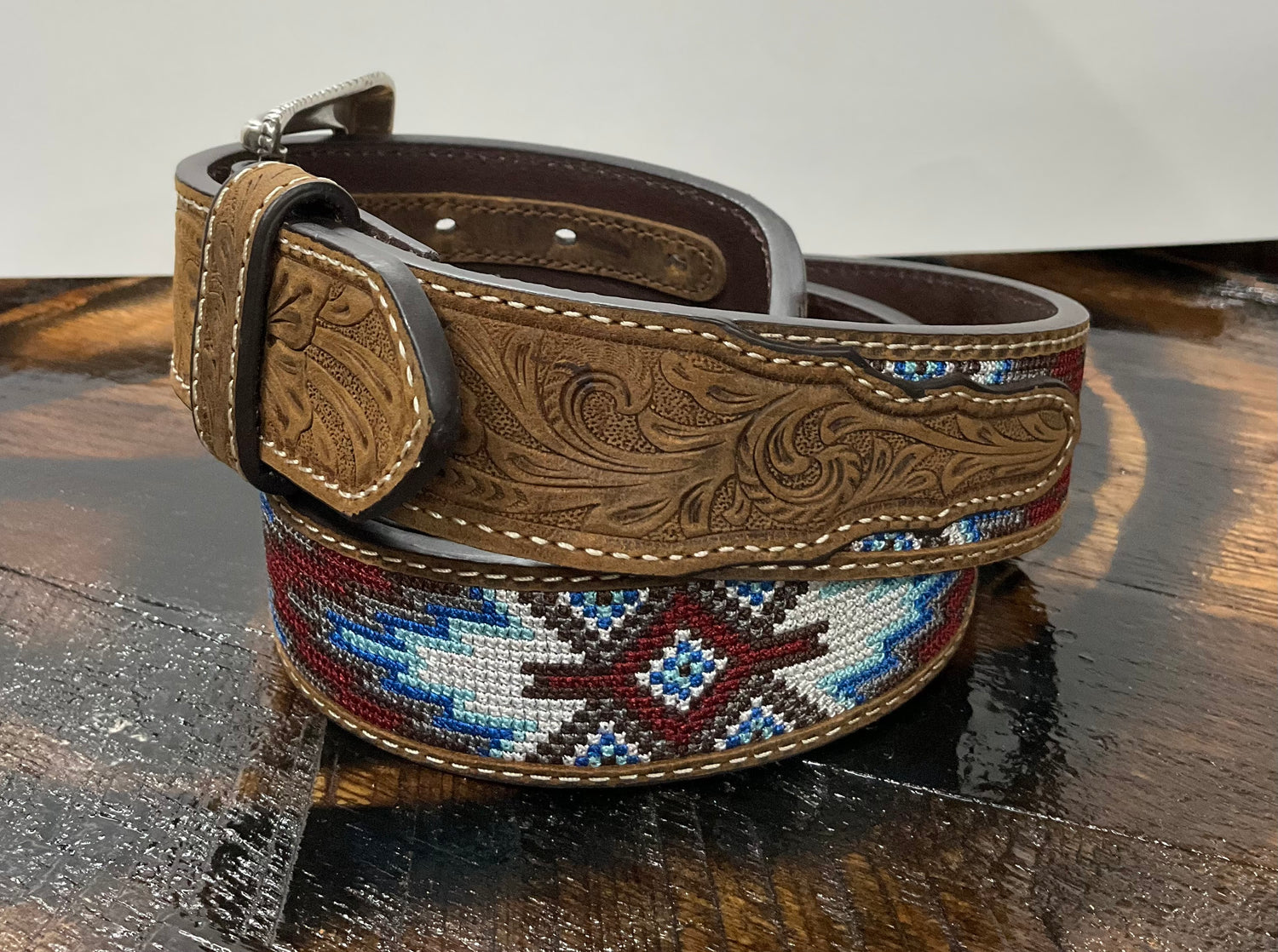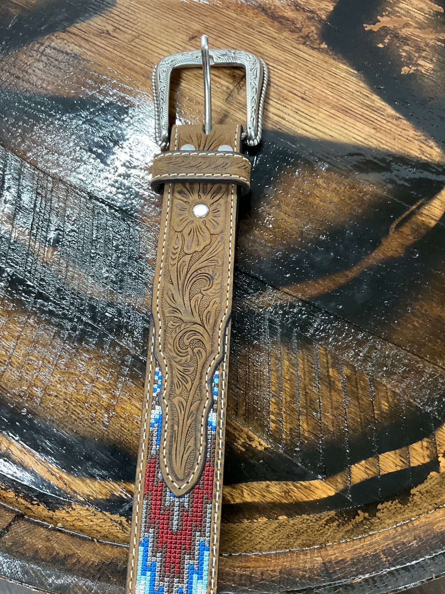 Tooled brown leather belt with silver buckle and colorful woven inlay. Western style with a pop of color.