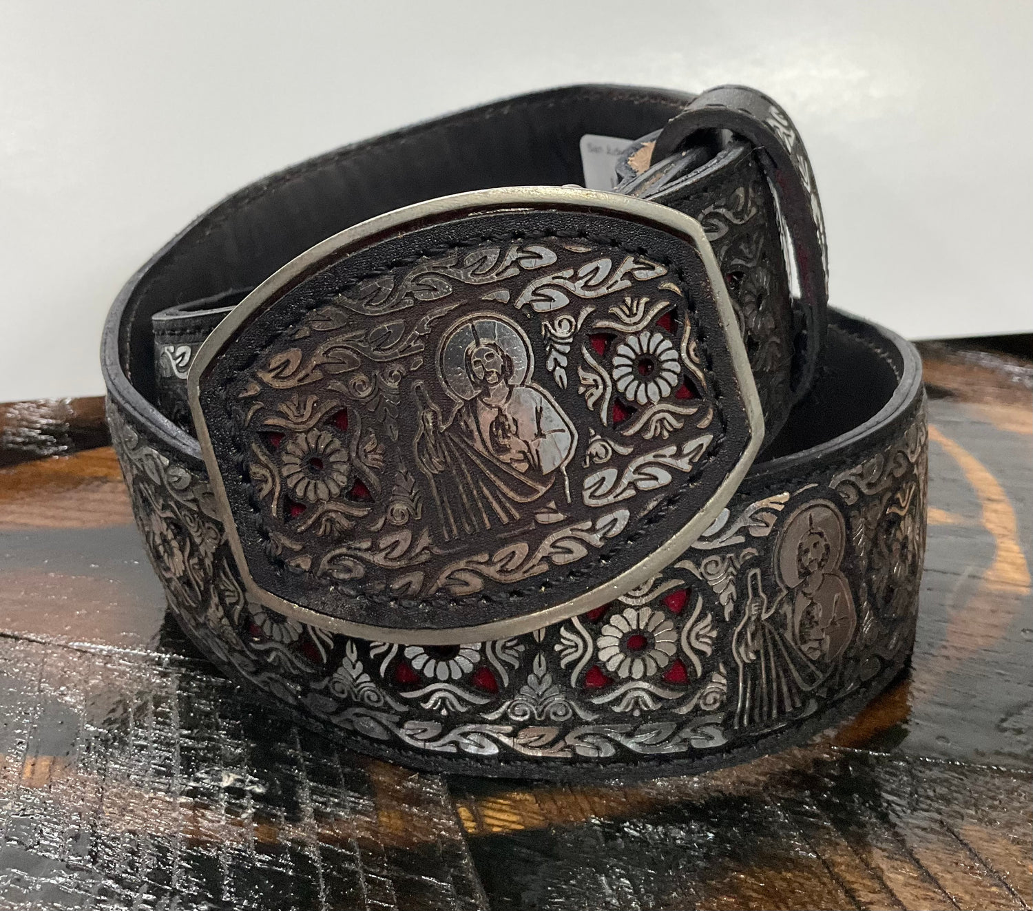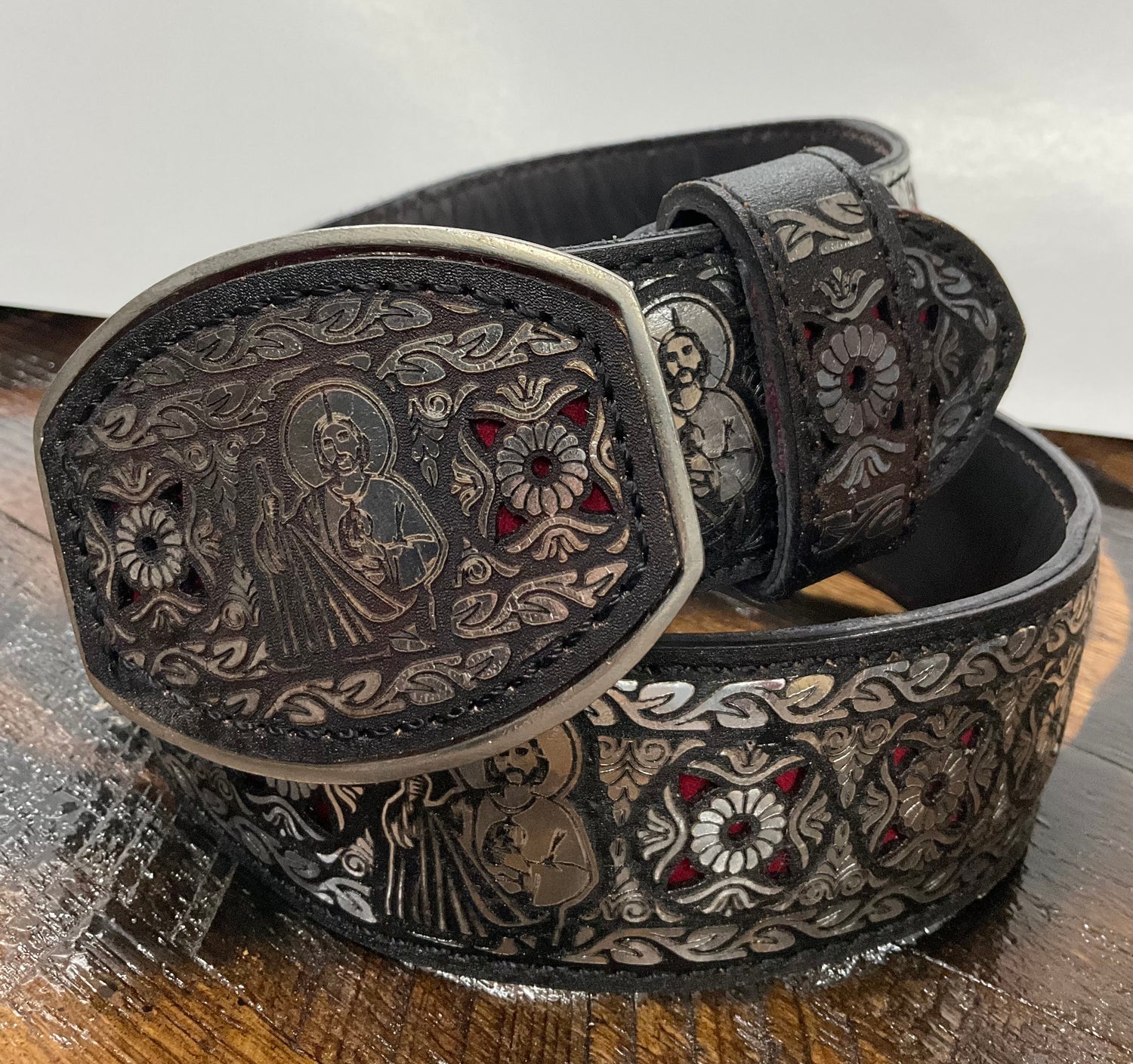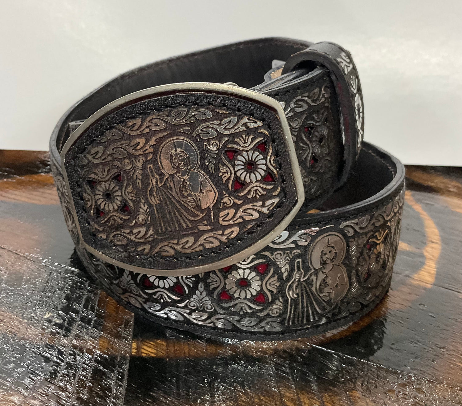 Cinto de piel con bordado floral e imagen de San Judas. Estilo vaquero con fe.