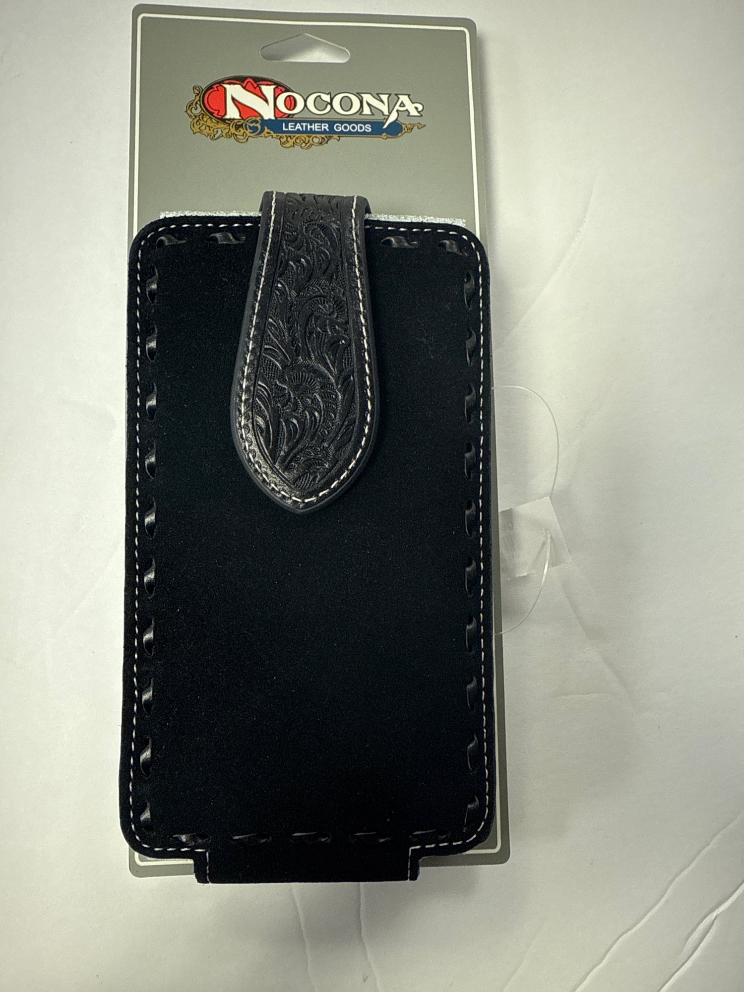 Keep your phone secure in western style with this Nocona black leather cell phone case. Crafted from durable leather, it features a sleek design with a magnetic closure and belt clip for easy carry. Ideal for everyday use. (Funda para celular de cuero negro Nocona, con clip para cinturón y cierre magnético