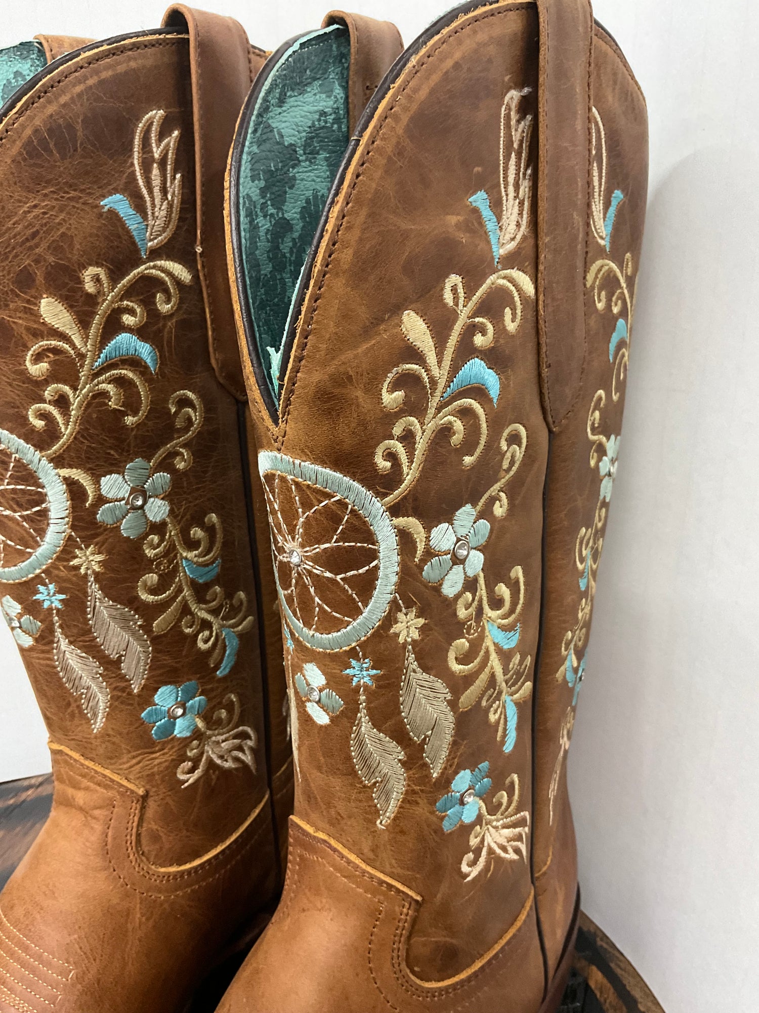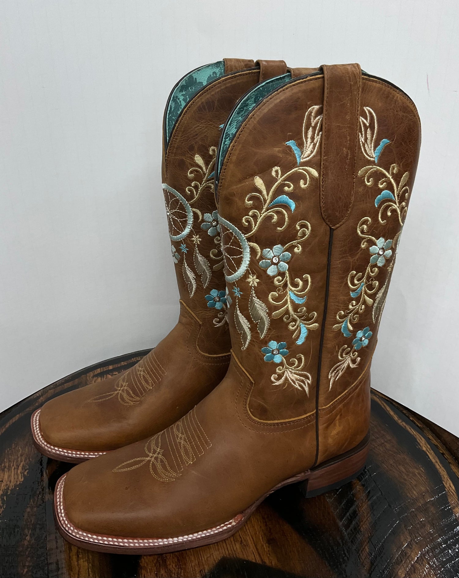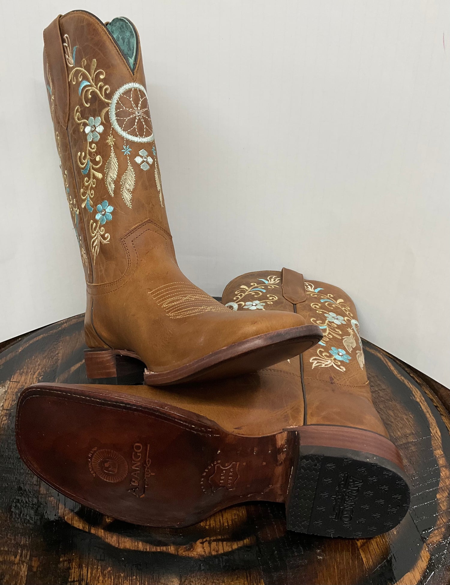 Add a touch of charm with this Arango women’s boot featuring the “Dreamcatcher” design. Made from high-quality leather in honey tone, it showcases beautiful floral embroidery in soft blue and ivory. Built on the Pro Dama fit for comfort and everyday western elegance
