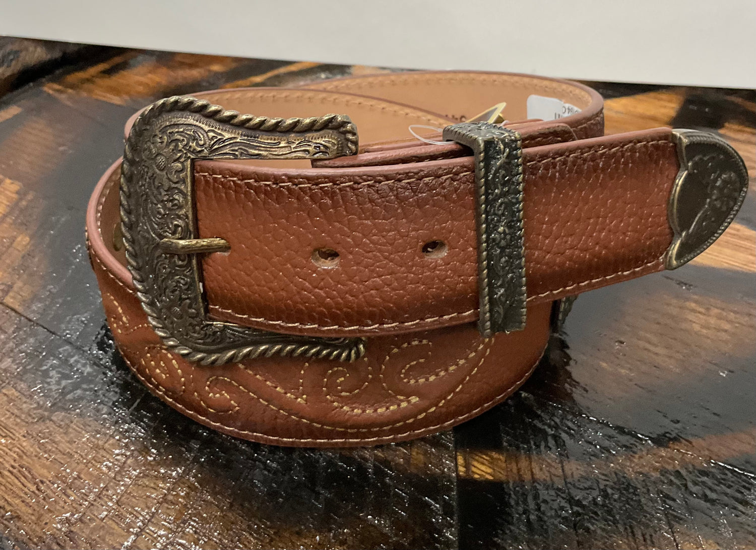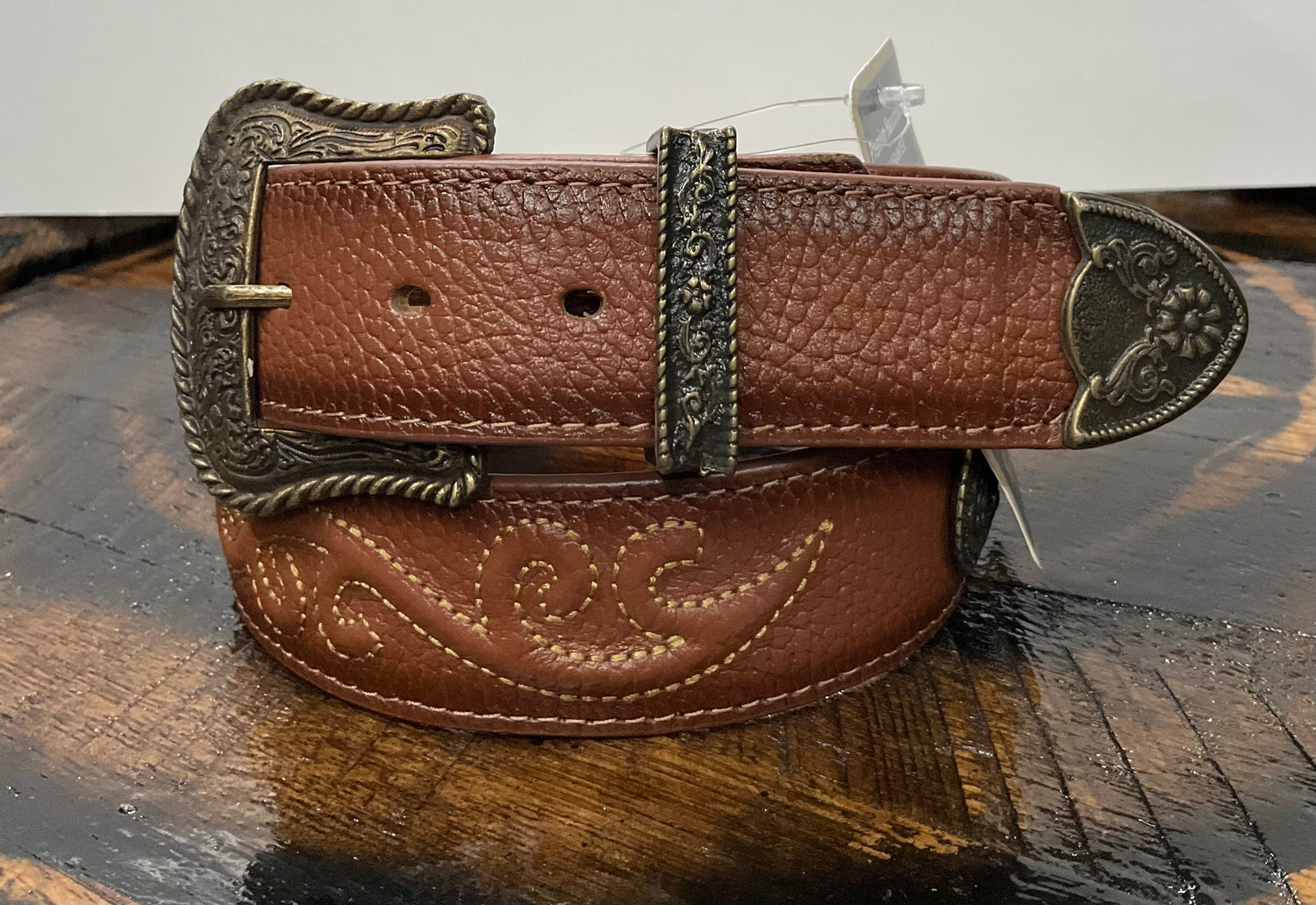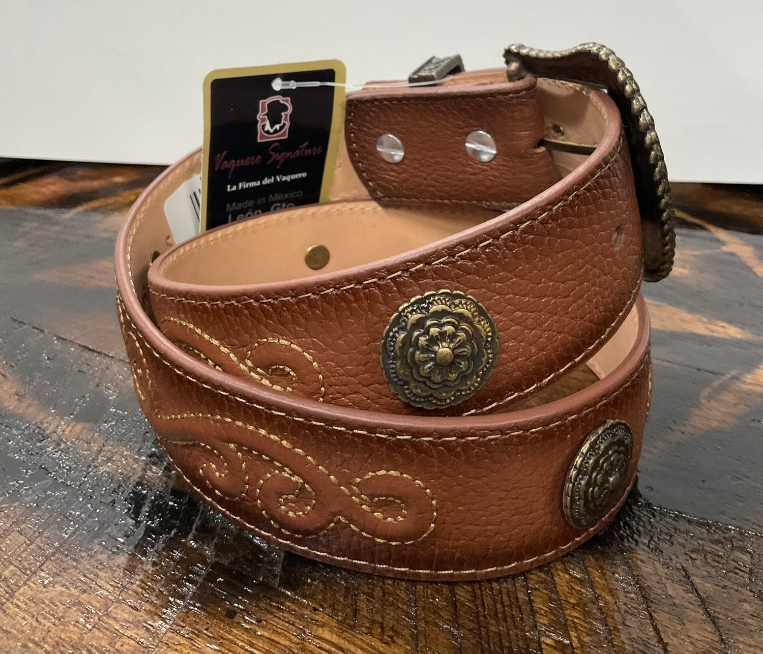 Brown leather belt with embossed details and antique gold conchos. Finished with an ornate vintage-style buckle. Classic Western charm.